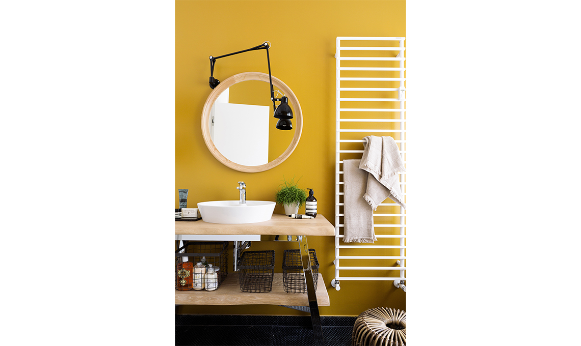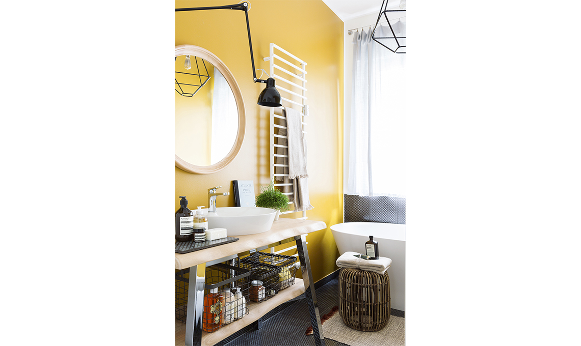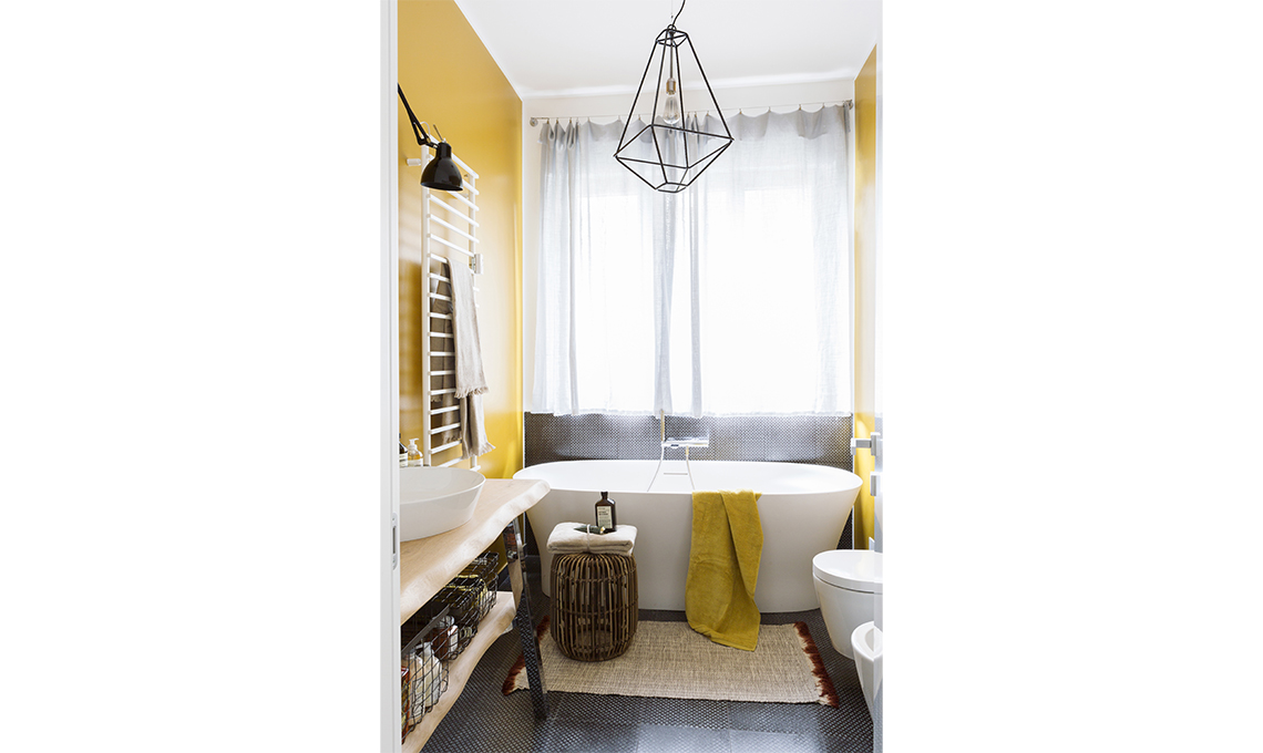 Il bagno principale ha le pareti giallo senape e abbina sanitari minimal a tocchi etnici. Vasca freestanding della serie Cape Cod [cm 185,5x88,5h €5.281] come il lavabo [ø cm 48 €817] e il mobile a cavalletto [cm 112x57h], tutti di [Duravit] come i sanitari sospesi ME by Starck.