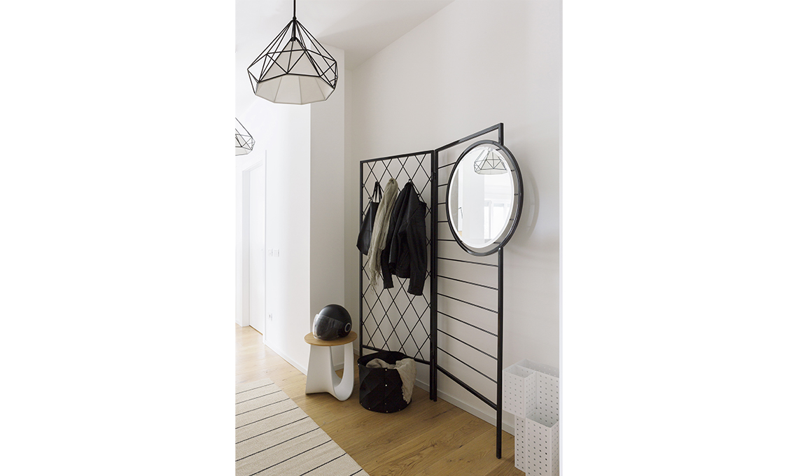 L'ingresso non è solo un passaggio, ma una vera zona funzionale. appendiabiti-séparé Apparel [Opinion Ciatti da Entratalibera, cm 156x185h €1.030]. Sospensioni [Dalani], portaombrelli [Creativando], contenitore [Fuscra su » debou.it], passatoia [Pappelina].