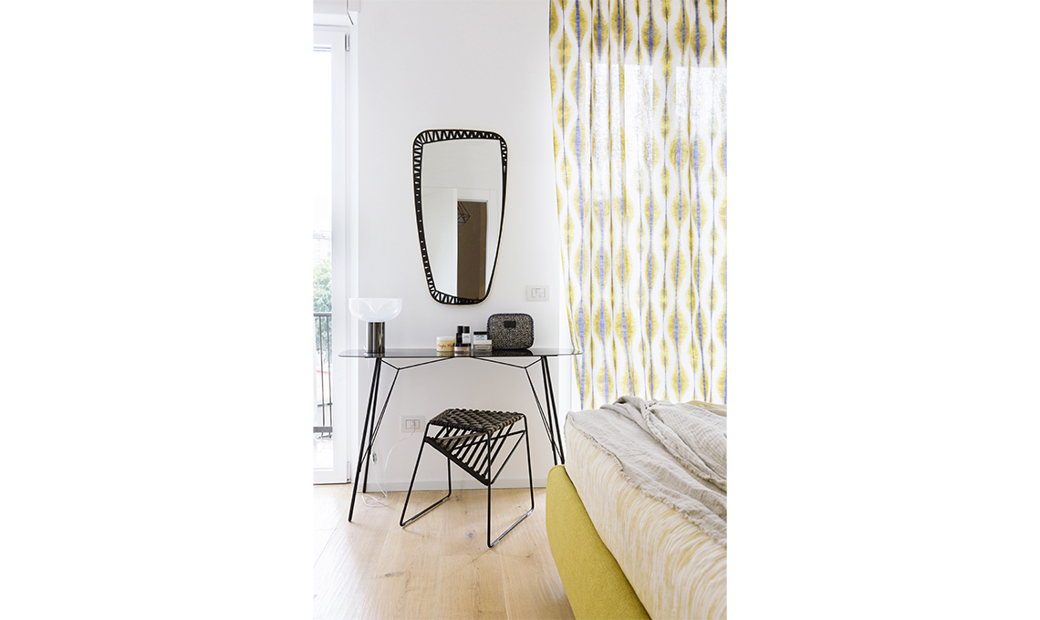 Console Mina e sgabello Twist [Zanotta €1.254 e €608] con lampada [Leucos], specchio [Tacchini], beauty [J&V Store]; tenda in tessuto Coban [Pierre Frey €128/m].