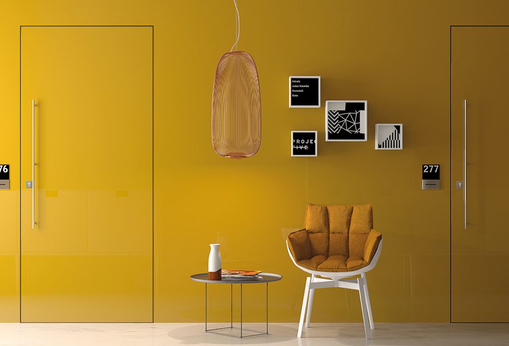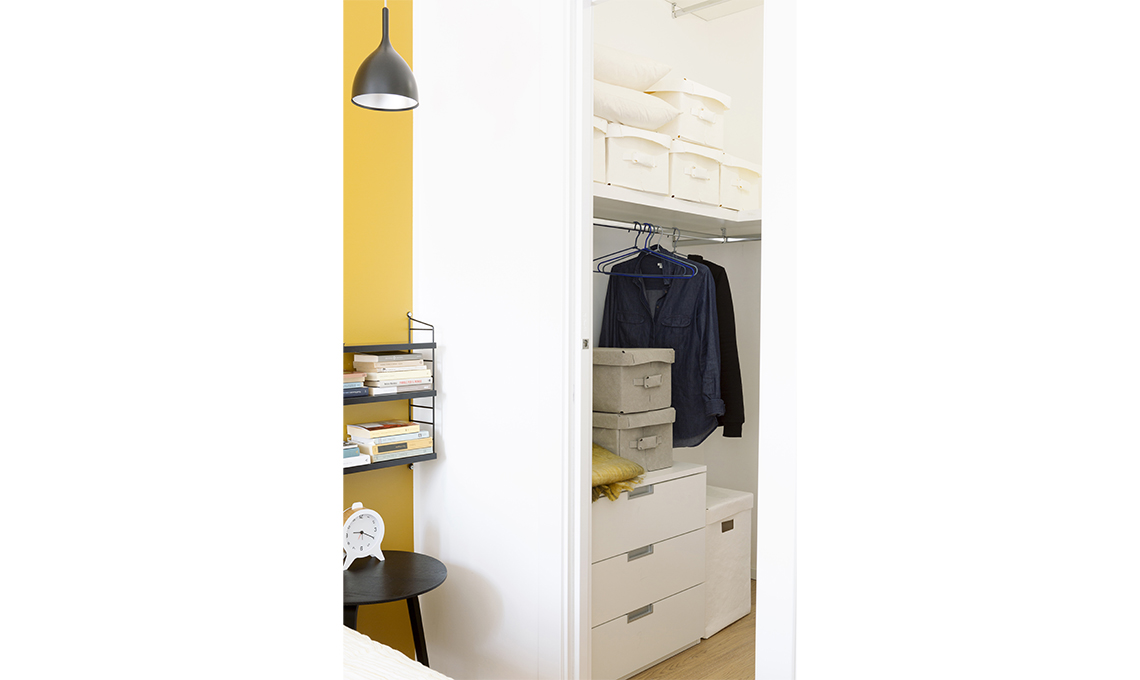 La camera matrimoniale non è grande (si è preferito lasciare spazio al soggiorno), ma è una mini suite con cabina armadio e bagno. Sulle pareti, smalto giallo senape Alpha Rezisto Matt [Sikkens F2.50.50]. Sommier Manhattan [Noctis]. Tocco perfetto, la sospensione Falkland [Danese].
