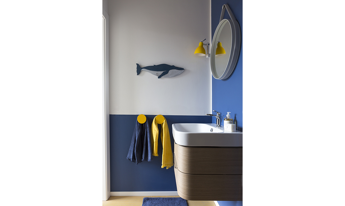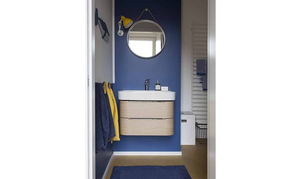 Il bagno piccolo è tutto blu, ma anche qui non mancano i tocchi di giallo... Mobile bagno sospeso con due cassetti Happy D.2 [cm 62,5x48x38h €1.736] di [Duravit] come il lavabo [cm 65x50,5x9,5h €330,60], specchio Strap [Hay da Design Republic, ø cm 50 €179].