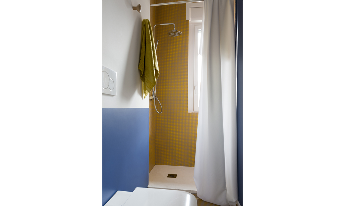 Il pavimento del bagno e le pareti della doccia sono rivestiti interamente con il mosaico ceramico Seta in monopressocottura composto su rete [Appiani €158,60/mq] nel colore Giallarancio.