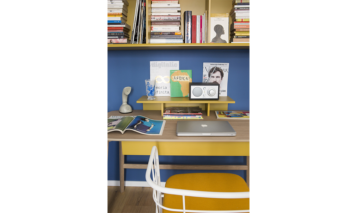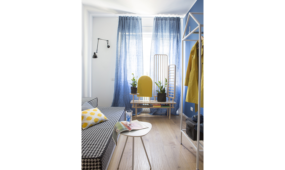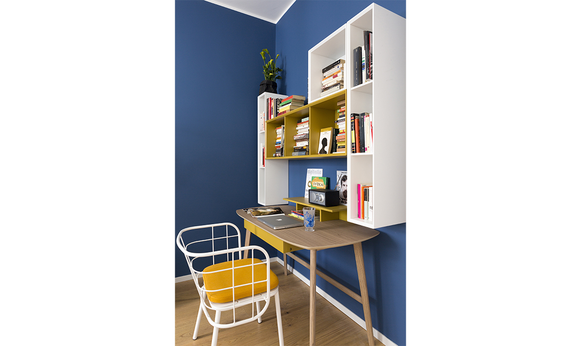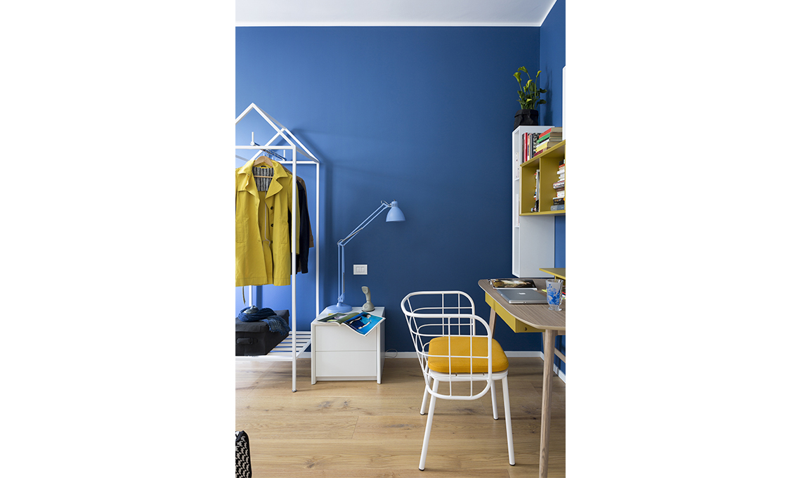 Annalisa, da brava pugliese, ha il mare nel cuore, perciò Vanessa ha pensato di dipingere le pareti del suo studio (che serve anche da camera degli ospiti) in una tinta blu mare, e di ricreare l’atmosfera di relax delle spiagge con arredi ‘easy’: l’armadio ricorda una cabina da spiaggia e il mobile sotto la finestra è minimal, in legno sbiancato. Gli stessi colori e finiture sono ripresi nel bagno piccolo. Pratico e chic il divano letto pied-de-poule in bianco e nero. Ora la casa è davvero perfetta per una ‘donna moderna’ che ‘moltiplica’ il suo tempo tra il lavoro, la famiglia e l’arte di girare il mondo.