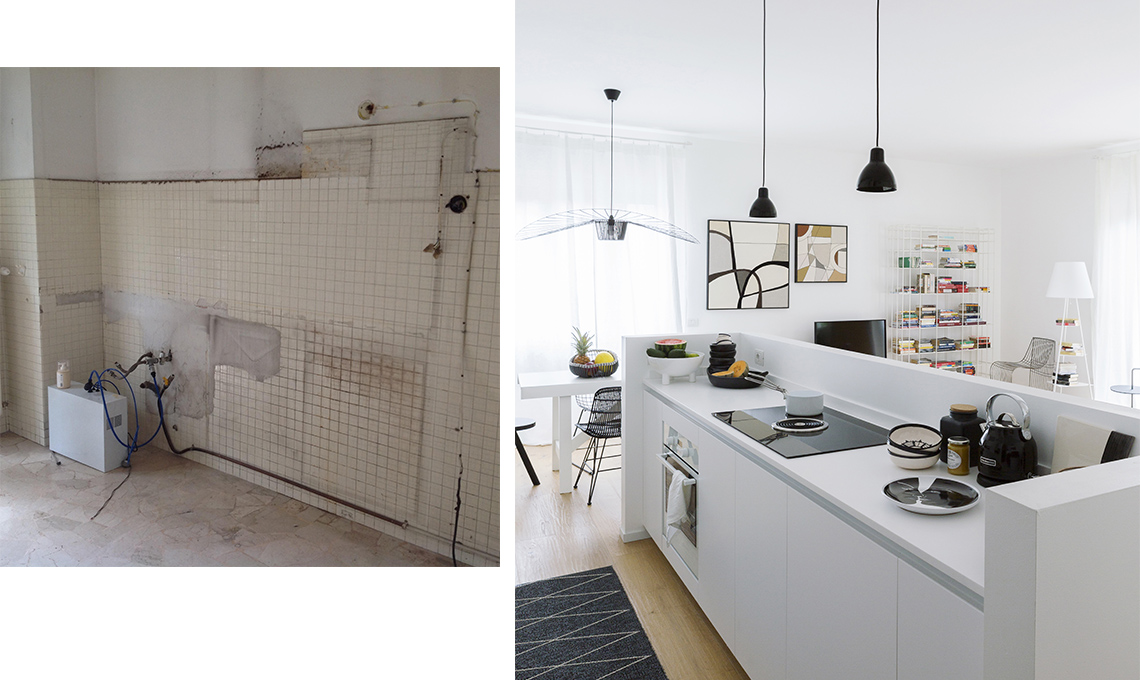 PRIMA & DOPO. La cucina era grande e isolata. Annalisa preferisce cucinare chiacchierando con la famiglia e con gli amici; così Vanessa ha progettato un’isola conviviale nel living, a stretto contatto con l’angolo pranzo. Un trucco: per evitare la cappa a vista, è stato scelto un modello integrato nel piano.
