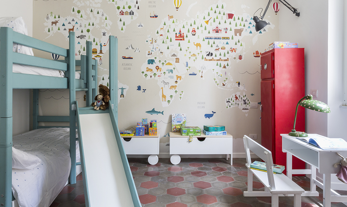 Letto a castello Classic con scivolo [Flexa] dipinto con vernice al gesso colorata. Sulla parete tappezzeria con mappa geografica per bambini Intrepid Cream [Murals Wallpaper, da € 31/mq].