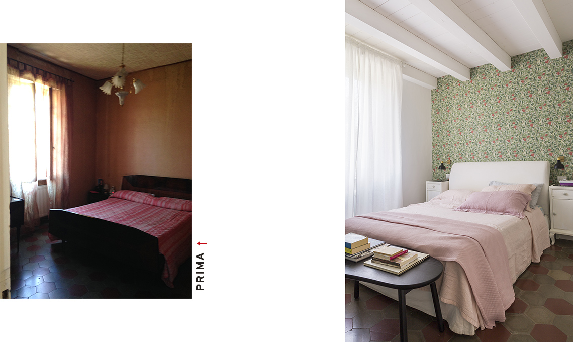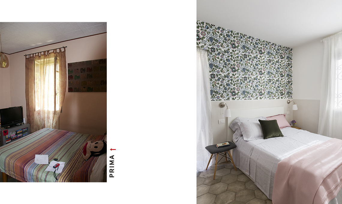 Nella camera della dépendance, letto matrimoniale Malm con box sottorete [cm 175x210x100h da € 349], appliques Årstid [€ 15 ciascuna] tutto di [Ikea]. Lenzuola [La Fabbrica del Lino], cuscino Carré in velluto verde [L’Opificio, cm43x43€98]. Tappezzeria
