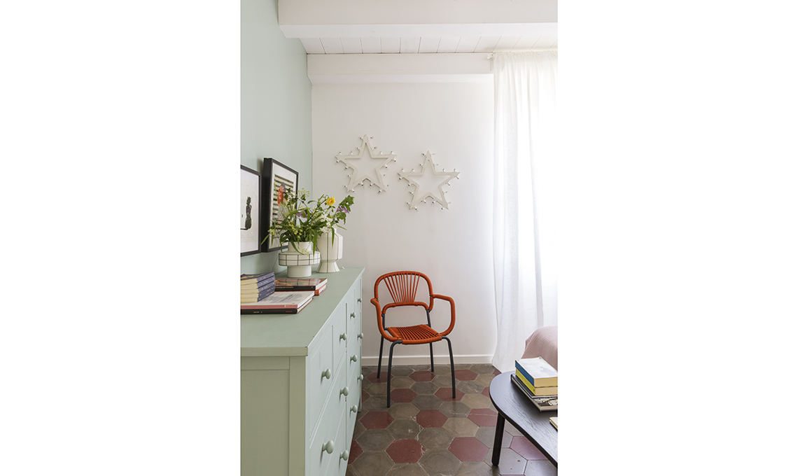 Nella vecchia camera scura è bastato passare a colori chiari per cambiare il mood. Sulla cassettiera [Ikea] ridipinta in azzurro come la parete, vasi [Mani ceramics, da € 180 cad], stampe Un Pulcino [Studio Mook], Donna Gatta [Francesco Graziosi] e Abbraccio [Paul Thurlby]. sedia Moyo [Chairs & More, cm 60x 54x85h € 519].