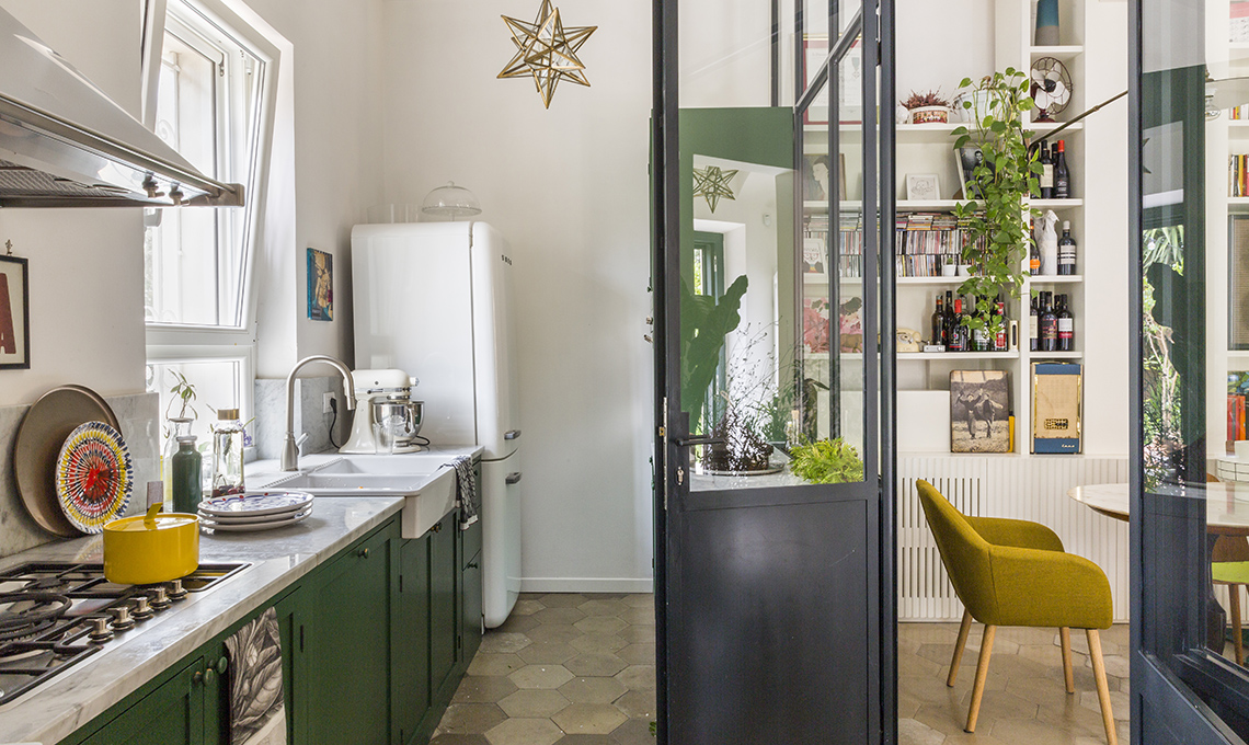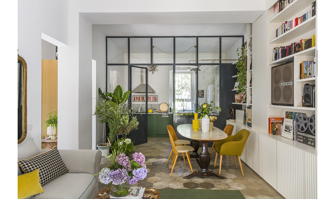 Vivere in un edificio storico è di grande ispirazione, ma richiede di adattarlo al proprio stile di vita. Studio Strato ha lavorato a un compromesso che mantenesse tocchi rétro e ricavasse un ampio spazio per gli amici e per tenere a vista i movimenti in cucina, da qui l’idea di abbattere i muri e inserire una vetrata.