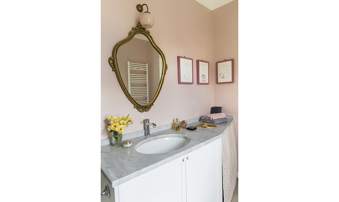 Mobile con top in marmo realizzato su disegno, specchio e appliques recuperati in un mercatino; quadretti rosa con bambino