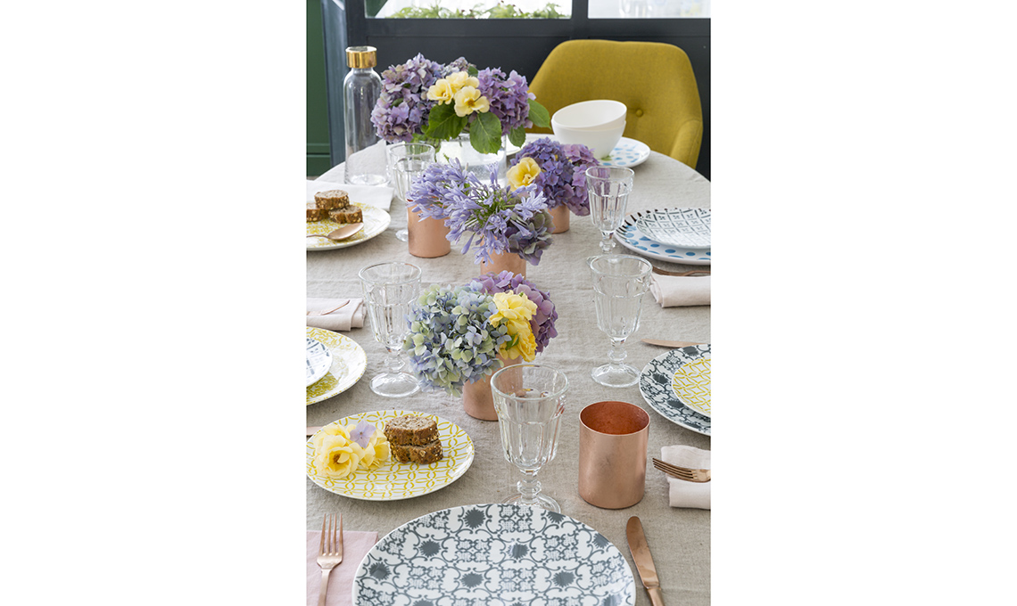 € 140 il set da 24 pezzi], bicchieri in vetro Pokal [Ikea € 2 cad] e in rame Lime Line Mule [KnIndustrie € 28 cad]. bottiglia 100 Tribute to Sottsass [FratelliGuzzini€34];tovaglia e tovaglioli [La Fabbrica del Lino], decorazioni floreali [Peperosa Flowers]. poltroncina Arnold color senape [Maisons du Monde, cm 62x58x 82h € 135].