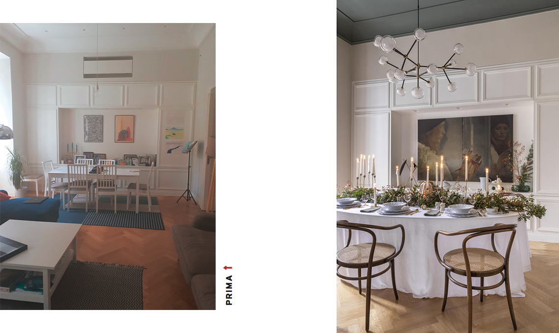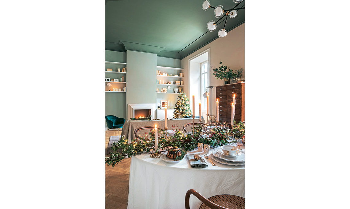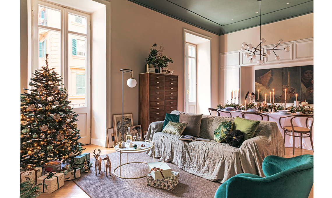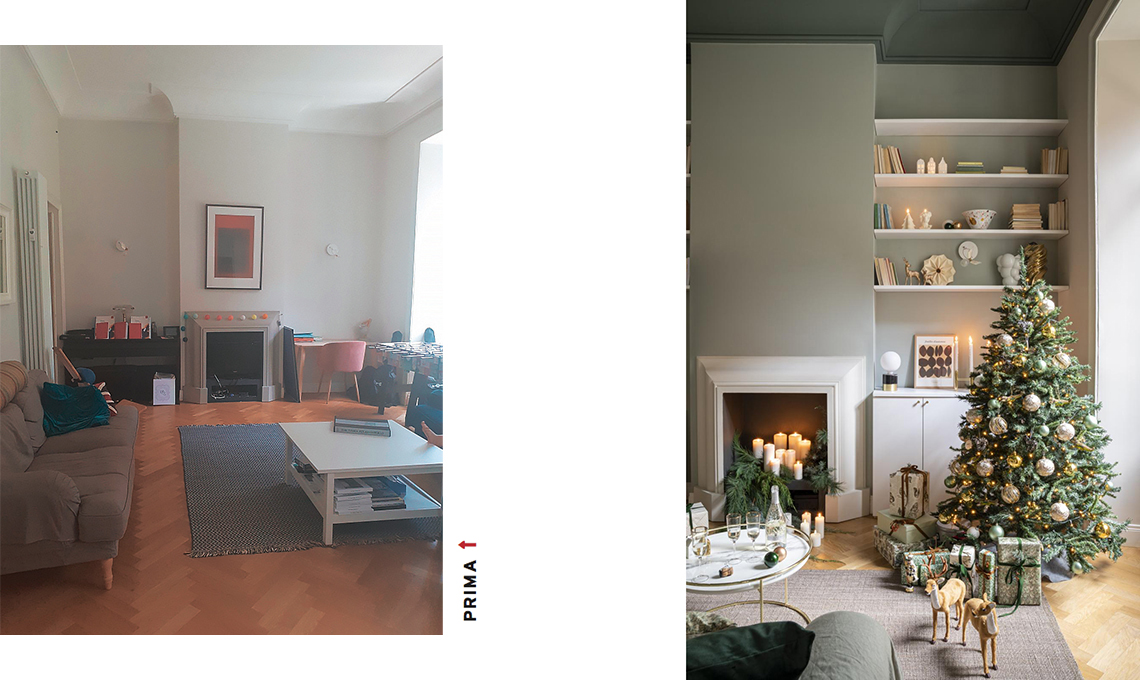 Eliminato il concetto dell’all white, i dettagli storici di porte, modanature e soffitti hanno ripreso a vivere tra colori polverosi e il tema del verde, che parte da un ‘guscio’ scenografico e profondo sul soffitto del salone. Il loro Natale non poteva che essere naturale, impreziosito da metalli e lucine!