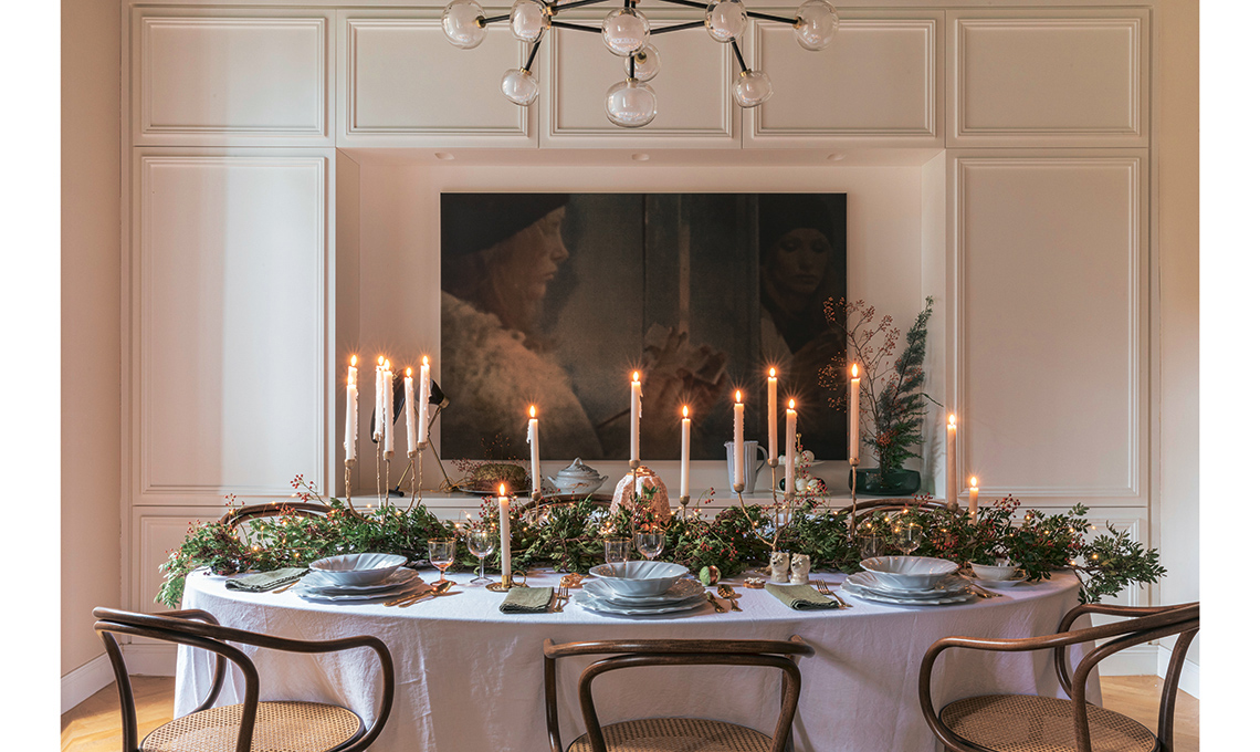 Lampadario Nabila [Tooy da Russo&DiMauro], sedia 30 [Ton da Mia Home Design Gallery], quadro di [Nora P.]. Nella nicchia del mobile contenitore, disegnato dall’arch. Gianfranco Previ, vaso Opti [Nude Glass], composizione [Copihue Floral Studio], alzata [Villeroy&Boch], brocca [Bottega Buonarroti], legumiera Midas [Rosenthal], panettone al pistacchio [Loison], lampada da tavolo [TNC Luce