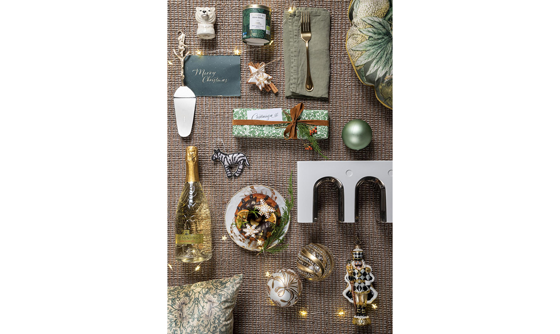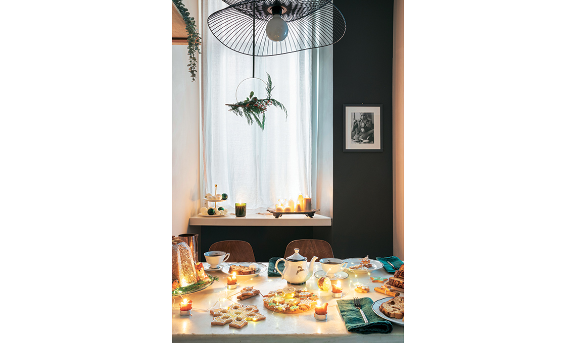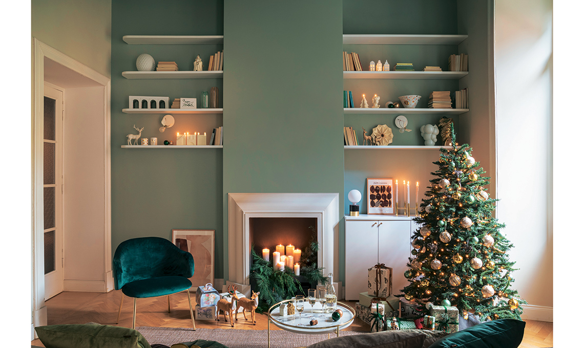 Ai lati del camino, mensole e mobile realizzato su disegno di Atypique Design Studio da [Falegnameria Faraone Lorenzo]. All’interno del camino, candele [Casa], composizione abete [Copihue Floral Studio]. Sulle mensole a sin.: vaso con forma architettonica Vittorio [LatoxLato], vaso a sfera Cairn Young [Rosenthal], coppia di vasi Sweep [&Klevering], candele Arches [&Soul], biglietto augurale [Cristina Pi]. A destra, t-light a forma di casetta [&Klevering], ciotola [Coralla Maiuri], vasi Skum e Squall gold [Rosenthal], stella di carta [Ferm Living su Smallable], candele Davide Christmas Trees [&Soul], cervo e capriolo Winter Collage Accessoires [Villeroy& Boch]. In basso, candeliere Lume [Calligaris], lampada [TNC Luce - Piccola Bottega], stampa