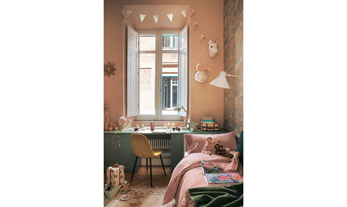 Scrivania progettata da Atypique Design Studio e realizzata da [Falegnameria Faraone Lorenzo]. A parete, stella decorativa [Smallable]. Sulla scrivania, giochi in legno, cavallo e giraffa [Cheries Wood], pallina Asinello [Alessi], candele Rudolph, Christmas Trees e Casa [&Soul], lenzuola [La Fabbrica del Lino], coperta [Lanerossi], piumini Perla e guanciali Diamante [Cinelli Piume e Piumini], cuscino [Kirkby Design]. Wallpaper June Beige di [Carta da Parati degli Anni 70].