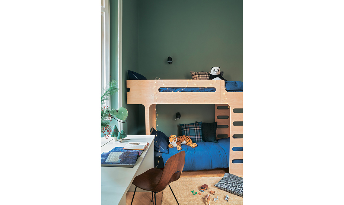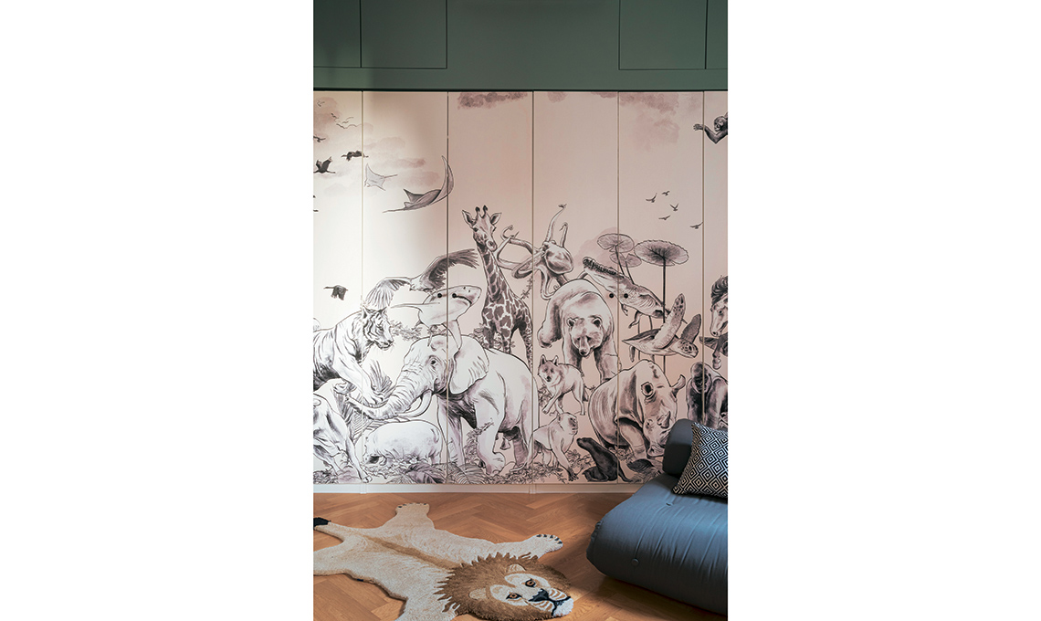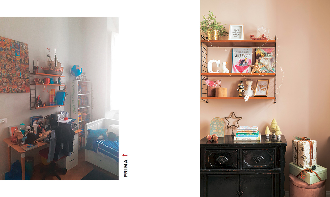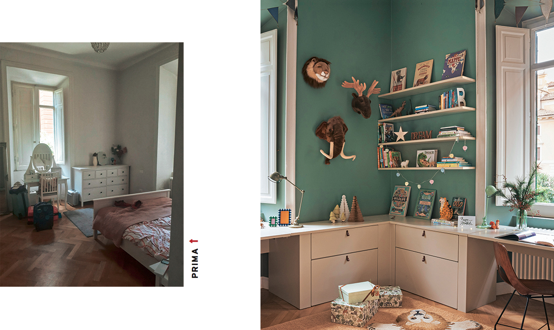 Il mobile con cestoni e scrivanie è progettato da Atypique Design Studio e realizzato da [Falegnameria Faraone Lorenzo], sedie di Augusto Bozzi [Spazio Ampio], portafoto Vicky e brocca jug leopard [&klevering]. Alberelli e vaso trasparente House Doctor su [Smallable], scatole realizzate con il motivo Safari [Grafiche Tassotti].