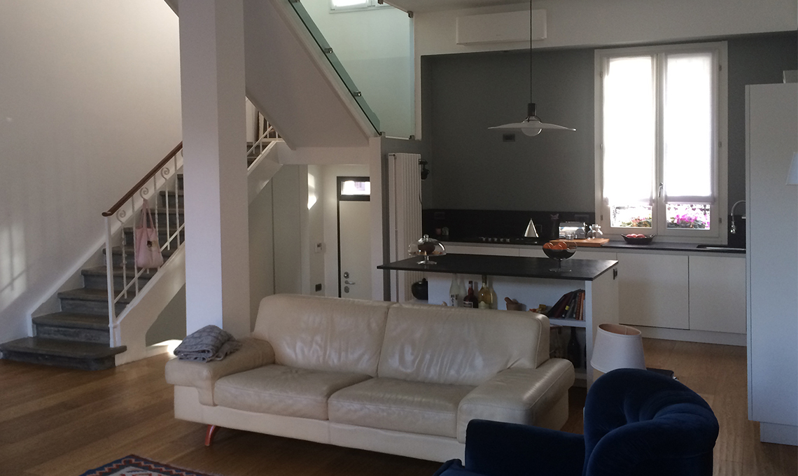 Prima il divano era l'unico elemento a separare il soggiorno dalla cucina; ora la parete vetrata segna il confine e fa "sparire" otticamente il pilastro strutturale.