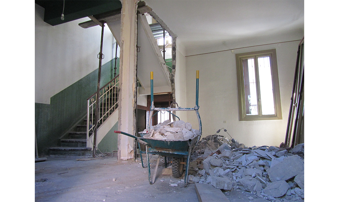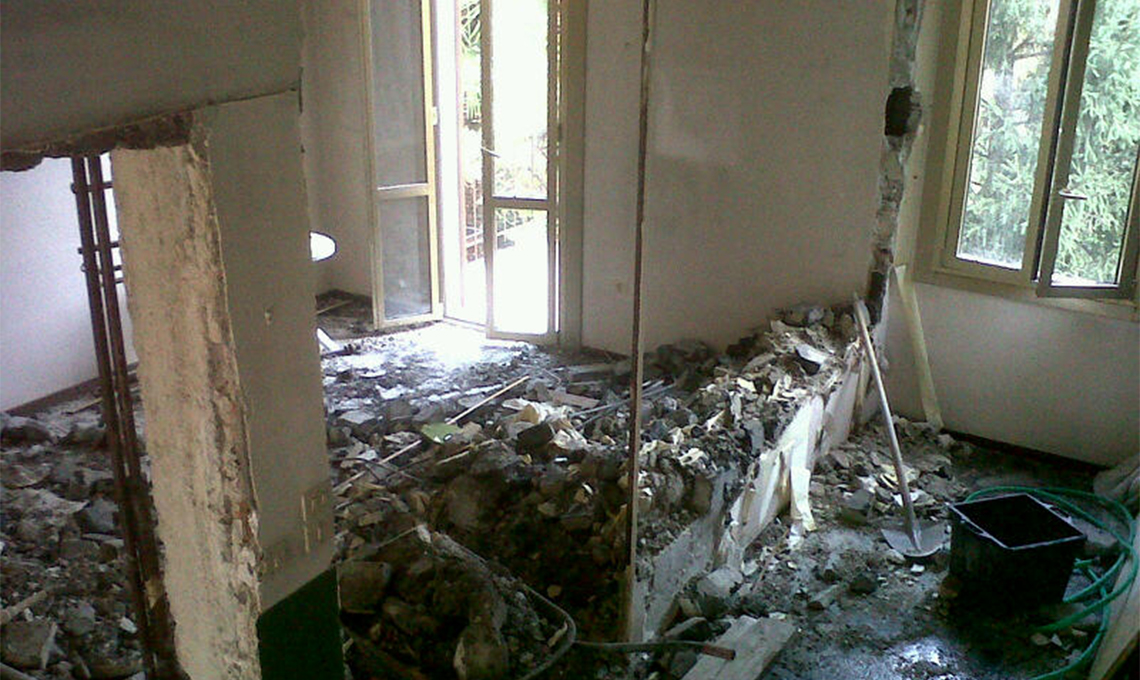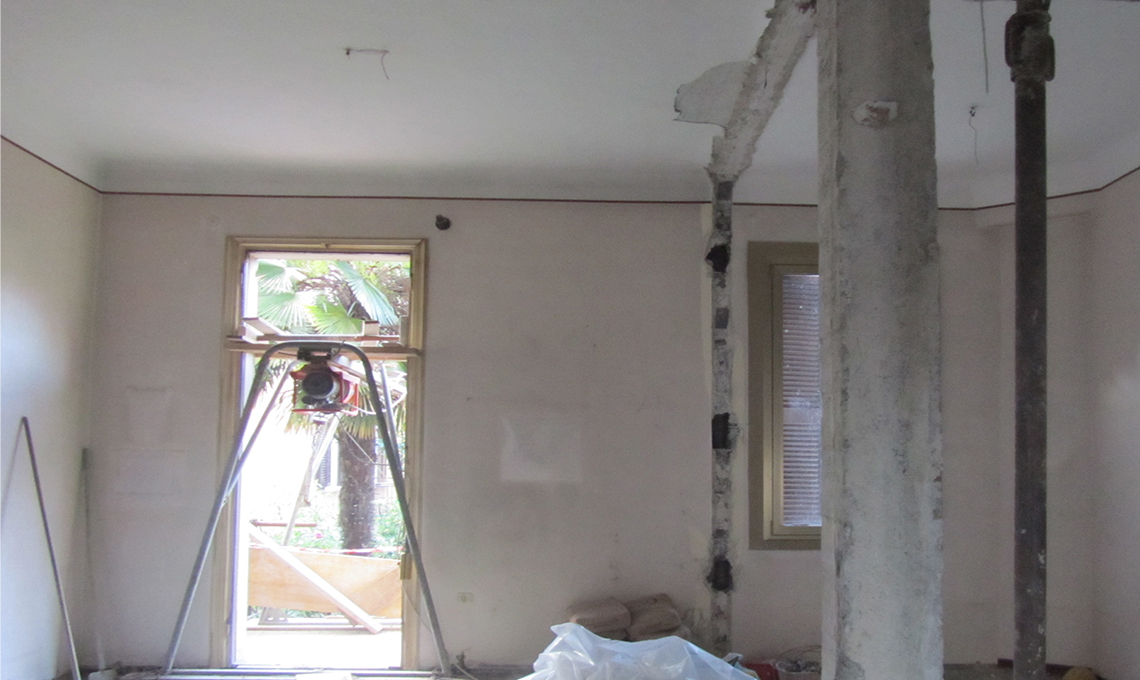 La casa in fase di ristrutturazione: a sinistra, lo stato di fatto iniziale, con le tre stanze divise; nella foto al centro, il locale open space. A destra, un dettaglio del relooking realizzato dalla stylist Vanessa Pisk.