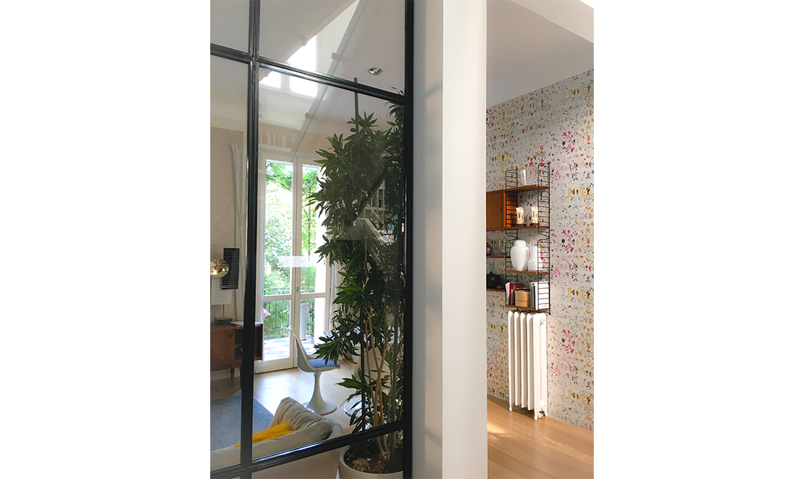 Qui il disegno della vetrata, una geometria regolare di rettangoli e quadrati di vetro extra chiaro, legati in una struttura in ferro verniciata con smalto nero satinato.