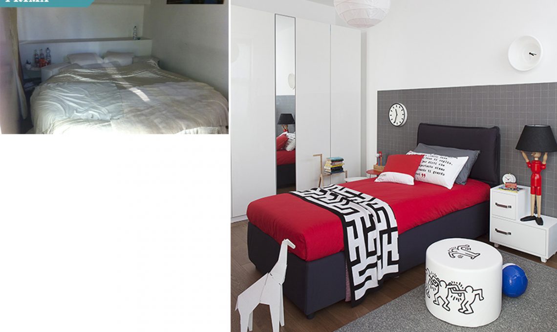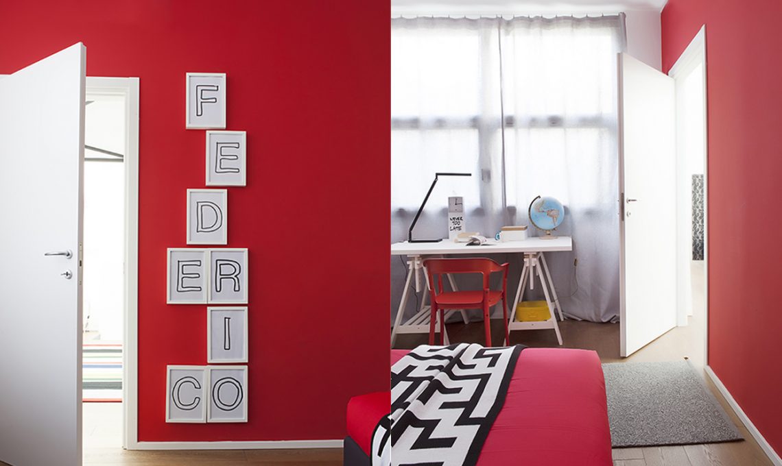 Il padrone di casa aveva bisogno di una stanza per il figlio e con Vanessa ha deciso di realizzarla accanto alla sua. Qui domina il rosso ben calibrato con bianco e grigio; sotto la finestra ci sta anche una grande scrivania. Una soluzione décor fai-da-te da copiare? La scritta Federico a maxi lettere fotocopiate e messe in cornici bianche appese accanto alla porta.