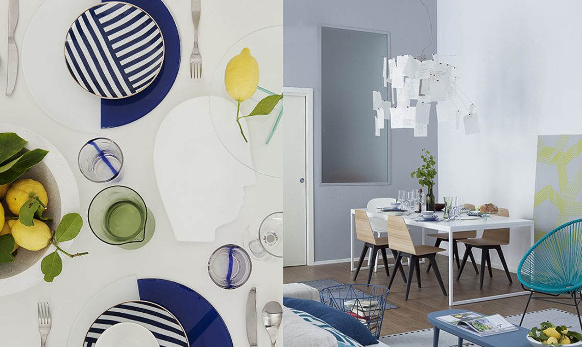Nella zona pranzo: tavolo Fronzoni [Cappellini, cm 100x200 €1.708] illuminato dalla sospensione Zettel’z 5 [Ingo Maurer da €770]; a capotavola sedia Napi [Bonaldo da €414]. Sul top, candelabro [Pastina da J&V Store], vaso a bottiglia [Iittala] e alzata in vetro [Madii, ø cm 30 €129]. Pannello con tessuto effetto 3D Ribbon [Nya Nordiska €103/m].