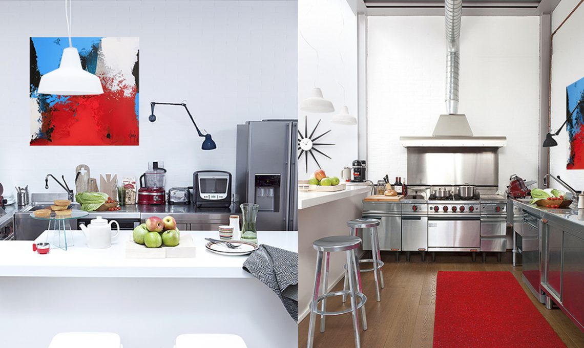 Per riprendere il mood della cucina industriale, gli sgabelli sono Déjà-vu in alluminio [Magis, Ø cm 33x76h €360 cad]. Macchina per il caffè di [KitchenAid] come il robot da cucina, caffettiera a stantuffo [Muuto su » trendhouse.it]. Sui fuochi, pentole Tools [Iittala da €145]. Il tappeto rosso Rita [Kasthall, cm 90x240 €1.230] si accorda con il quadro di Giorgio Giardina che fa parte del circuito Carré d’Artistes [» http://www.carredartistes.com].
