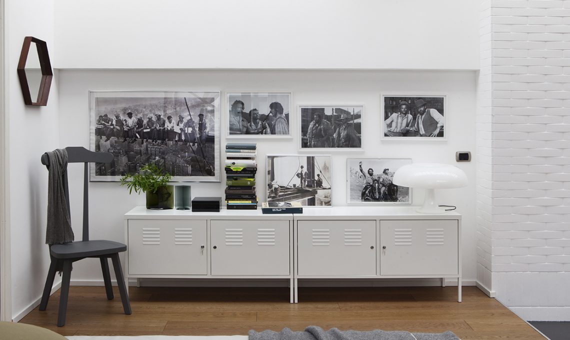 Al piano terra c’è il living con cucina: spazi distinti ma ‘che si parlano’ grazie ai colori chiari: bianco soprattutto, abbinato a nuances dal grigio all’azzurro. L’arredo è composto da pezzi vintage mixati a mobili di design. I trucchi décor? Oltre ai pannelli rivestiti in tessuti fantasia, da spostare dove si vuole, i tappeti ‘doppiati’ e il rosso che irrompe qua e là, in cucina e in una delle camere.