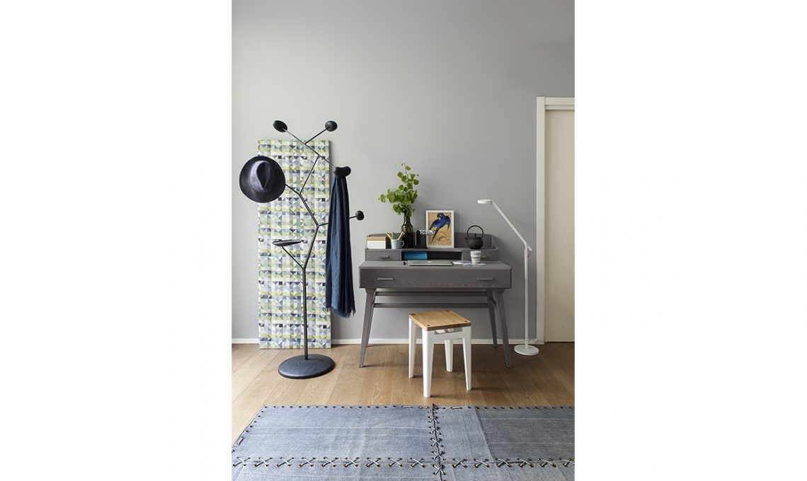 Un altro pannello rivestito è accanto alla porta d'ingresso e fa da sfondo all'attaccapanni che si trova vicino all'ingresso e di fianco alla scrivania.