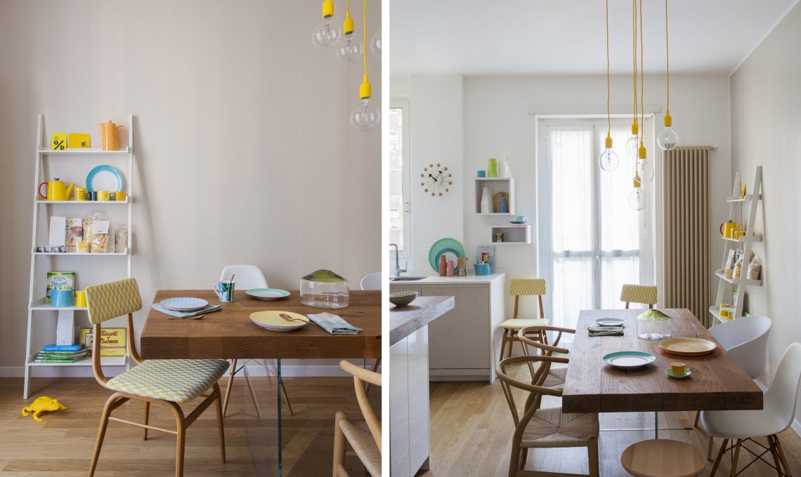 Tavolo Air Wildwood[Lago, cm 190x85 da €2.389]; sedie: Y Chair [da Mc Selvini €803]; Anni ’50 [Nap Atelier €250]; About a Chair 22 [Hay €255 da Design Republic]; Eames Plastic Side Chair [Vitra]; sgabello [da Arcarreda €375]. Lampade E27 [Muuto €65 da Design Republic]. 'Scaletta Morgan' [High-Tech, cm 50x34x190h €126].