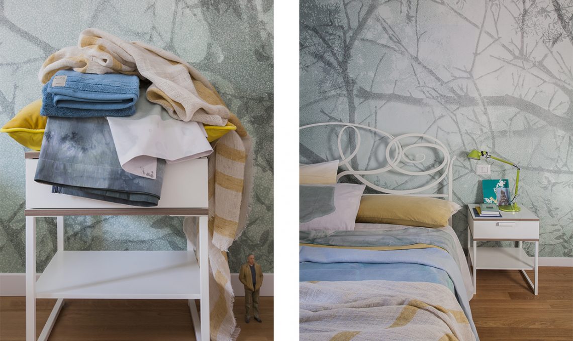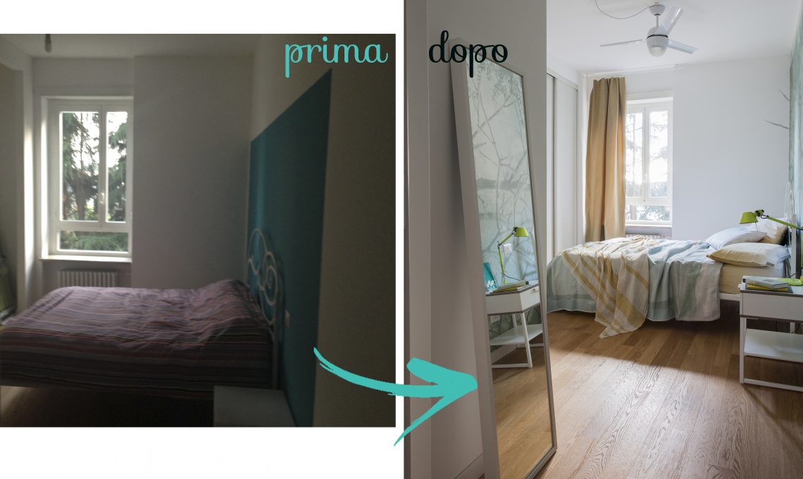 La camera era spoglia. Dietro al letto c’era un riquadro turchese che risultava troppo forte e isolato sulla parete. È stato sostituito da una delicata tappezzeria. Inoltre il corredo letto e le tende, sull’azzurro e il giallo, hanno reso tutto più soft e si accordano con il mood della casa. Rossella aveva chiesto alla stylist «un’atmosfera onirica» e l’ha avuta, con questa carta da parati dal ricamo di rami, a tutta parete, perfetta per assecondare il suo spirito romantico: «Al mattino mi sembra di aprire gli occhi in un bosco in controluce» dice. Il trucco in più? Il disegno dei rami sulla carta è stato prolungato sulle pareti adiacenti: una decoratrice ha dipinto i rami direttamente sulla parete, creando un effetto avvolgente, creativo, artistico! Per sapere come ha fatto, guarda il video di questo prima&dopo!