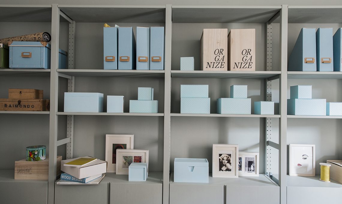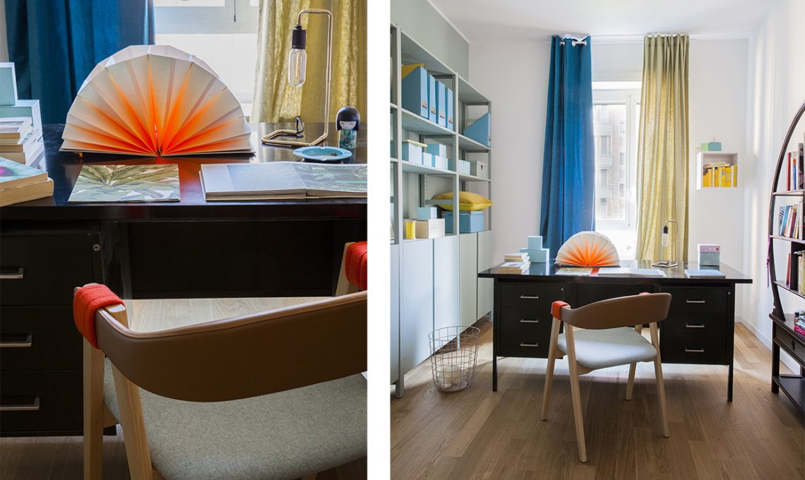 La camera in più è stata trasformata in uno studio. Qui la stylist ha avuto una geniale idea décor. Ha arredato la parete con la libreria Ivar di Ikea in legno grezzo, l'ha trattata con il fondo BL Unifill bianco, e poi dipinta con smalto all’acqua Rubbol BL Magura colore L0.04.65: è lo stesso dell’idropittura Alphamat passata sulla parete dietro [tutto di Sikkens]. E questo è il trucco: mimetizzare la libreria con la parete in modo che il décor sia poi dato dalle scatole in cui si ripone l'archivio di casa. Qui è un'armonia di contenitori in celeste e legno chiaro: scatole in legno [Design Republic]; in cartone Pallra [€16,99/4pz] e schedari Fjalla [€4,99/2pz], tutto di Ikea.