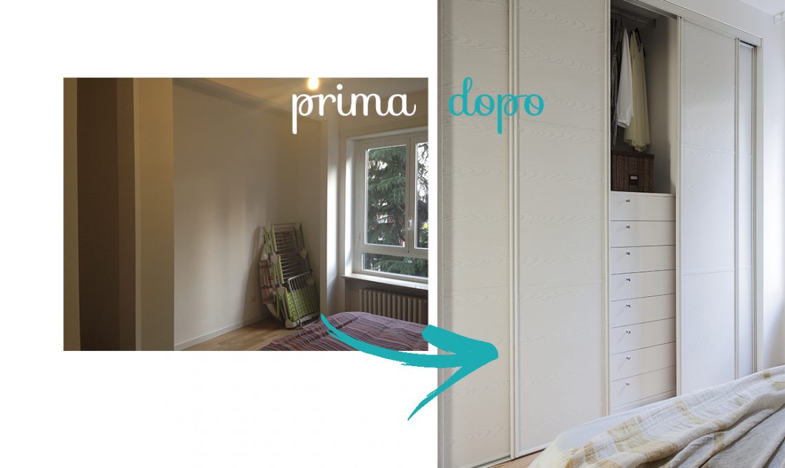 Qui è stata ricavata una specie di cabina armadio con struttura in cartongesso e ante scorrevoli [Toledo di Leroy Merlin, cm 120x270h, apertura cm 60 €290]