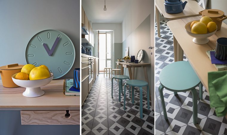 In questa casa soggiorno e cucina sono separati, non si è creato un open space. Tuttavia si è scelto un trucco per dare la sensazione di maggiore spazio e di unità fra le stanze: posare il parquet in rovere chiaro per tutta la lunghezza della zona giorno, facendolo proseguire dal living alla cucina, attraversando il corridoio.