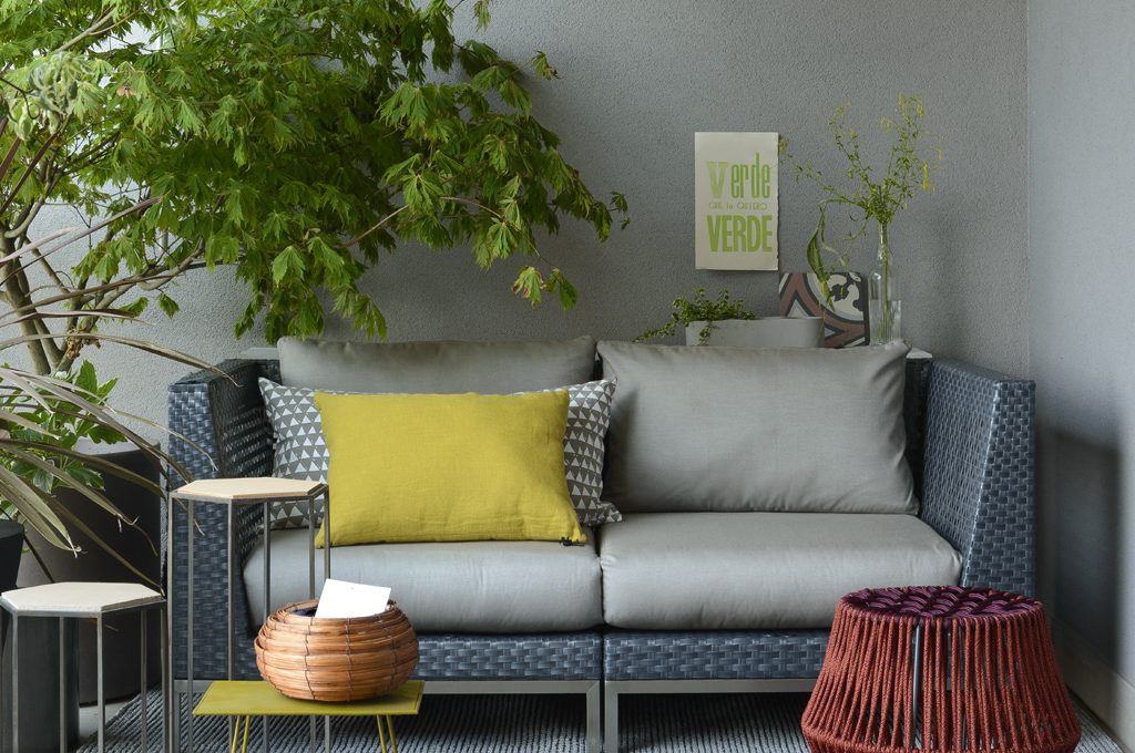 Il sofà, in buone condizioni, è stato solo rivestito con tessuto tecnico In&Out grigio chiaro [Sunbrella®, cm 140h]. In contrasto ci sono ora il cuscino giallo [Elitis €72] e l'altro geometrico (La Rinascente €68]. A destra, tavolino in ferro e corda Ziggy [Saba Italia, cm 44x40h €580]