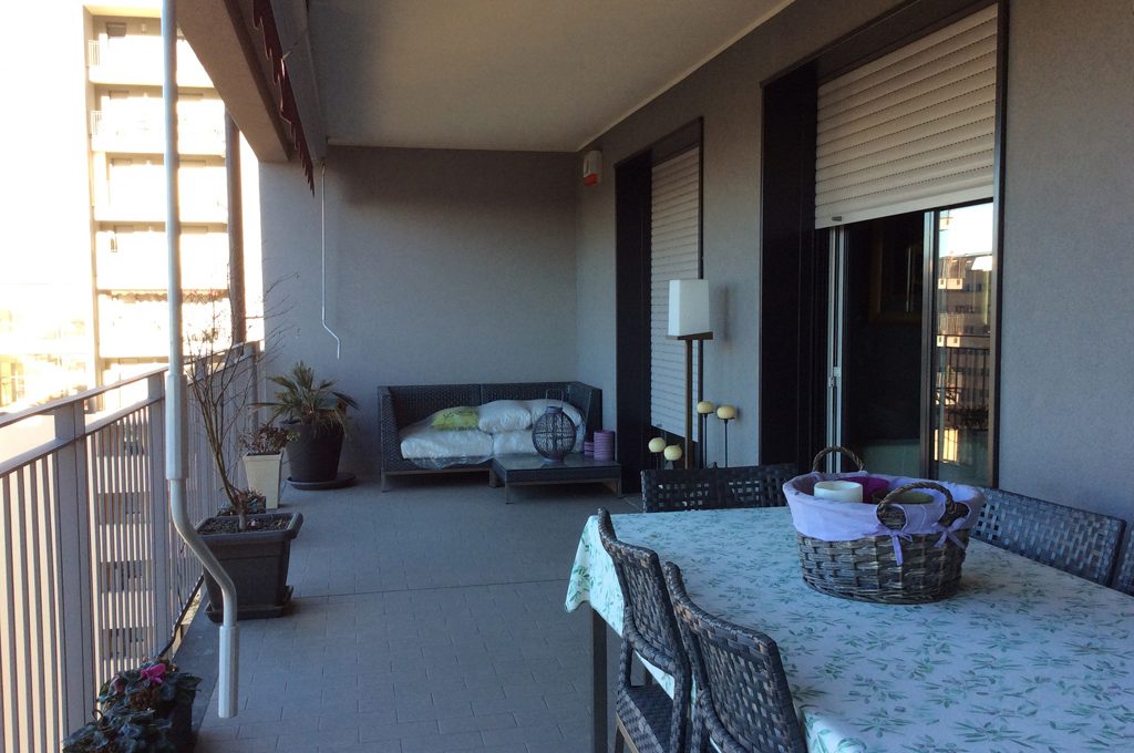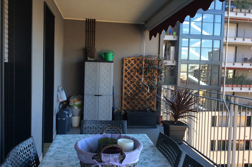Prima: il lato opposto del balcone era invece un disastro! Vicino alla cucina, era una sorta di ripostiglio open air con bidoni per la raccolta differenziata, vasi inutilizzati e un armadietto in plastica per scope e attrezzi...