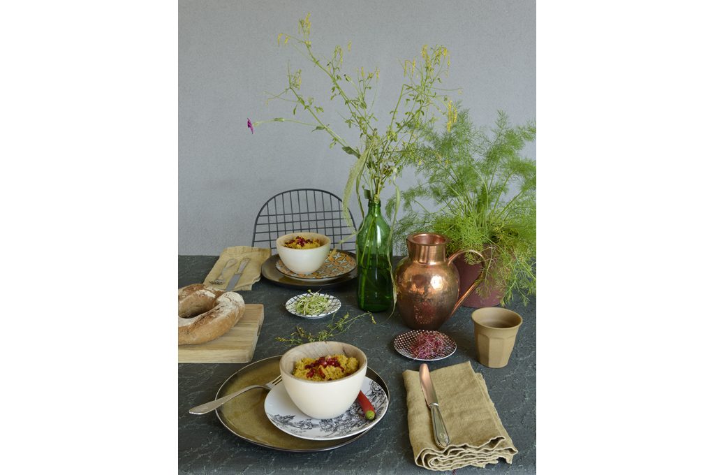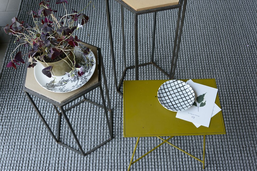 I dettagli contano, come negli interni: tavolini esagonali con top in argilla [Domenico Mori da €450]; tavolino giallo [Antonino Sciortino] e tappeto Loop [Warli cm 200x300 €1.746]; sul piatto floreale [Isi Milano €30], un trifoglio viola