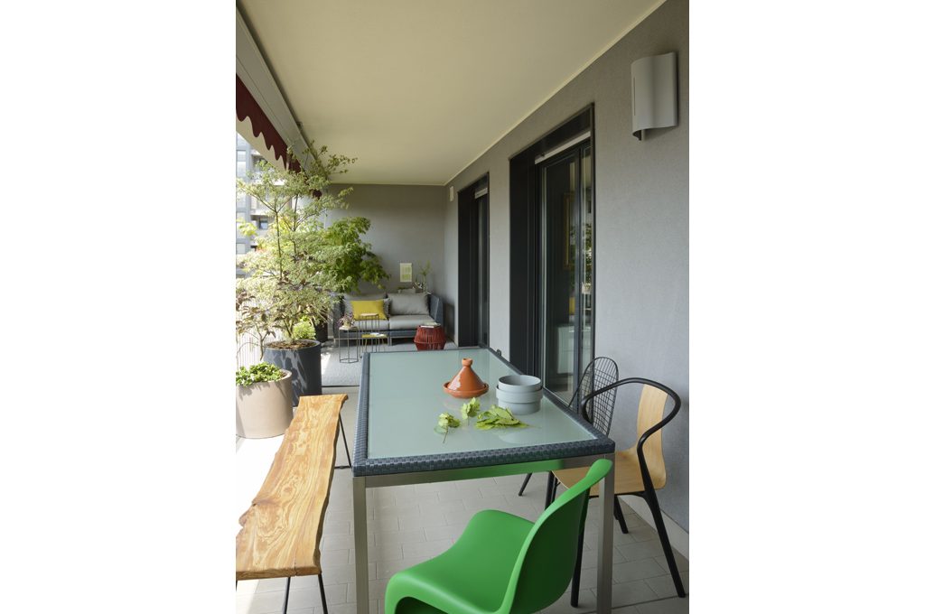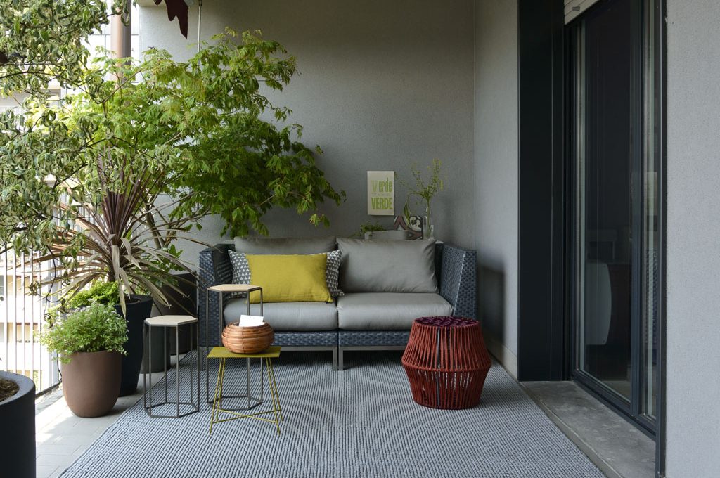 Non fosse per la ringhiera, a sinistra, il terrazzo sembra proprio un living! Il fatto di essere coperto e protetto, come un'altana, ha facilitato il relooking della stylist, ma a dargli un'aria 'di casa' sono il divano, il tappeto e i dettagli décor, oltre ai vasi di Ingegnoli e Fornace Fusari