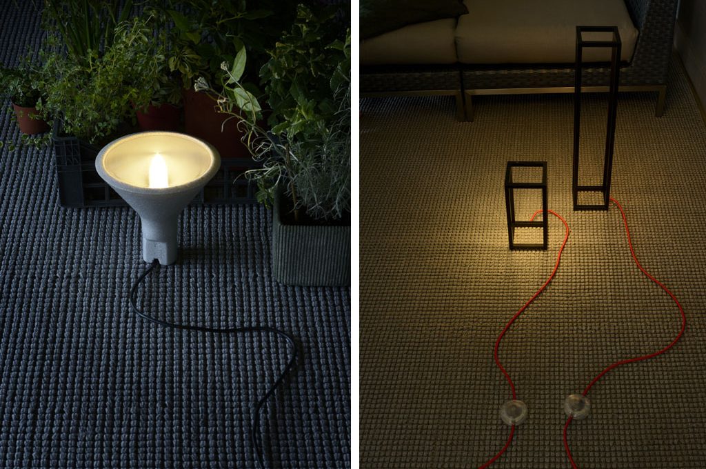 Sul terrazzo ci sono anche, da sin.,Yupik che sta dritta e inclinata o si aggancia sul tavolo [FontanaArte, Ø cm 21x20h €140]; FiloCUBO, con luce LED integrata, che sembra una scultura in alluminio [Filodesign, da cm 12x12x25h da €350].