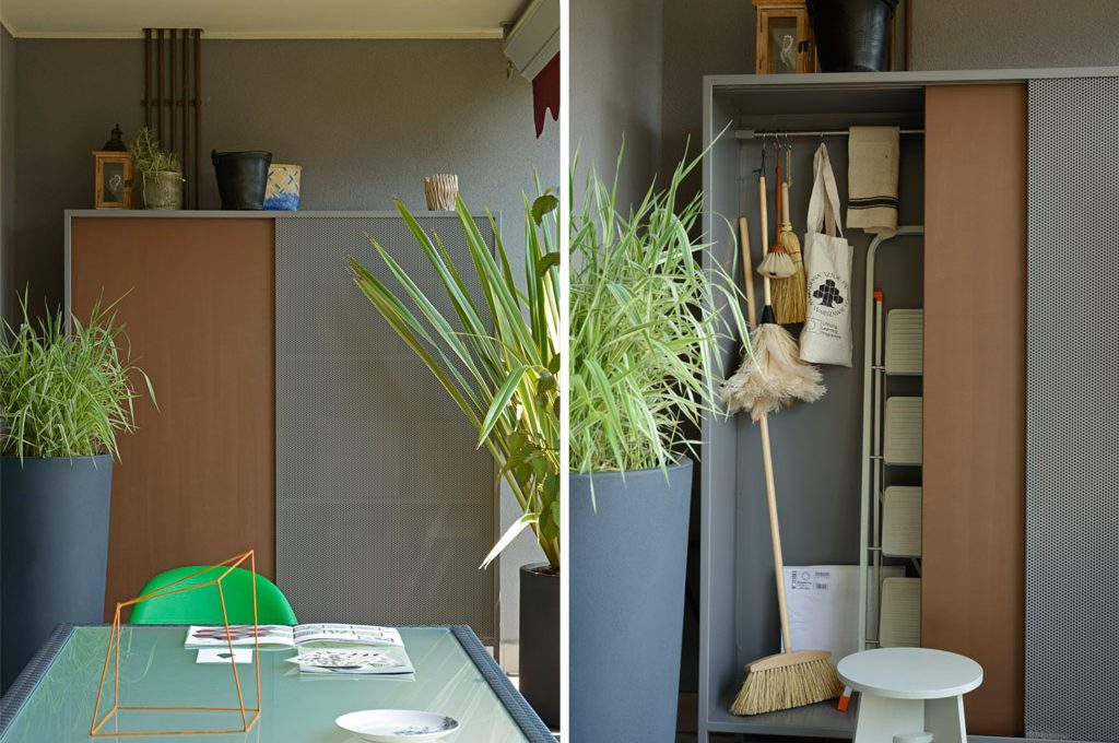 L'armadio-ripostiglio è pensato come un mobile di casa, bello e funzionale. Costruito da un fabbro, su disegno di Giovanna Fra, ha un'anta verniciata marrone e l'altra grigliata [Italfim]. Sgabello [da Rossana Orlandi]. All'interno: scope e attrezzi [da Ceratina], strofinaccio [Puebco]