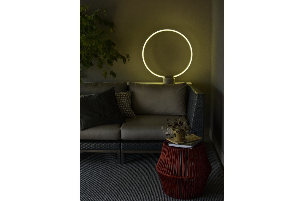 Per illuminare il sofà e creare un punto focale, la stylist ha aggiunto il tocco poetico della lampada da tavolo Archetto Shaped Outdoor un cerchio di luce LED, in silicone con base in cemento [Antonangeli, Ø cm 64 €970]