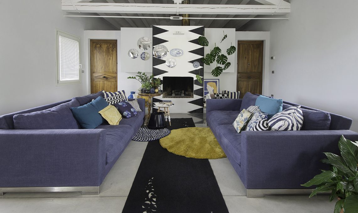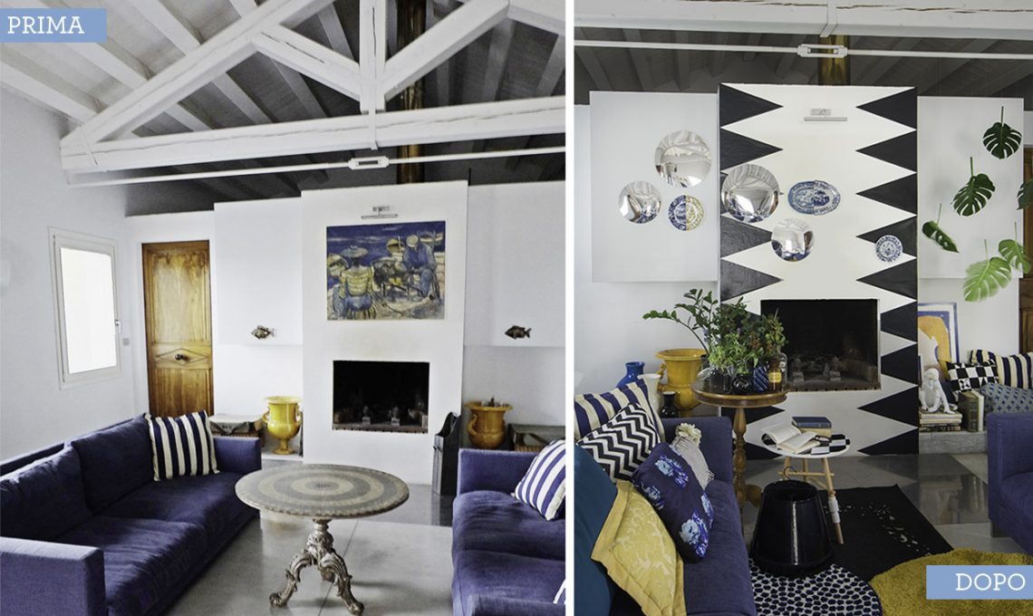 «Quando ho visto la casa per la prima volta, mi è sembrato subito di percepirne lo spirito: da un lato l’amore per i pezzi antichi della proprietaria antiquaria, dall’altro la tendenza al rigore, alle linee pulite. Amo i luoghi con una doppia anima, e questa casa colonica, ristrutturata ma un un po' vuota, è stata l'occasione perfetta per celebrare il matrimonio fra décor e rigore. Antico e moderno, brocantage e geometria. Ecco la chiave per riempire le grandi pareti vuote con rigore, ma anche personalità. Con queste linee guida in testa, la scelta del décor è stata semplice: ispirata dai divani blu e da un paio di anfore color ocra, ho voluto partire da questi colori dando loro maggiore impatto visivo e abbinandoli a un universale e sempre incisivo black & white (perfetto quando si lavora con pattern geometrici!). E poi tante piante per portare vita nella stanza».