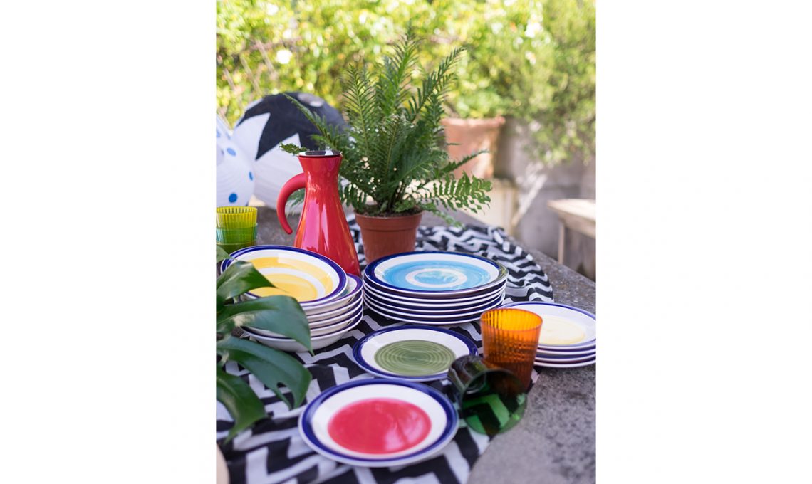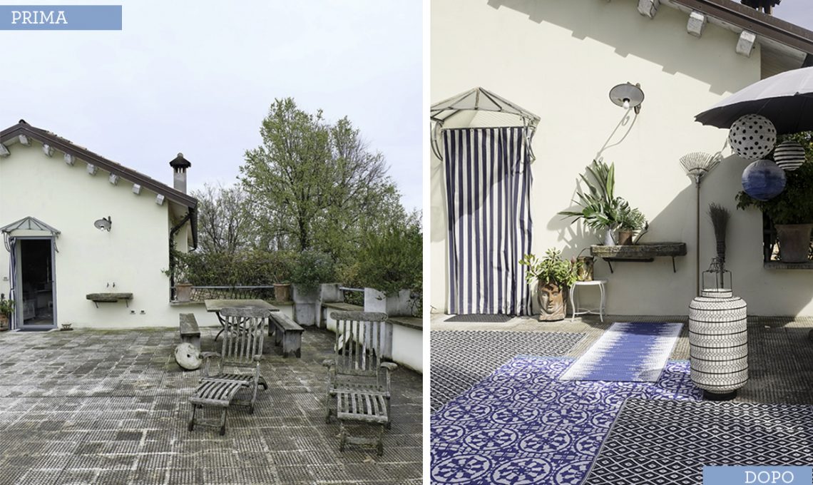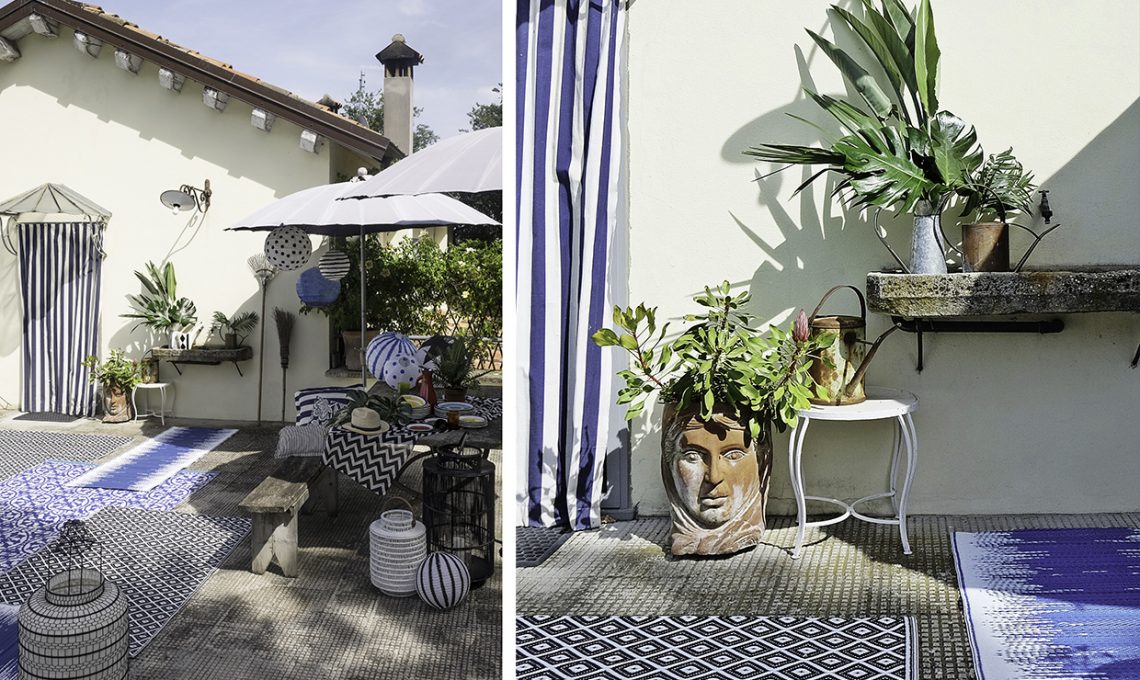 Anche all’esterno i tappeti si moltiplicano. Sono in polipropilene: b&n Kamari [cm 120x180 €39,99 e cm 180x270 €59,99] e blu Santorini [cm 160x230 €149,90] di Maisons du Monde, bianco a strisce blu Sommar [Ikea €9,99]. Lanterne in bambù nera [€256],bianca [€147] e cinese in metallo e tessuto [€365] tutte da Officina 33.