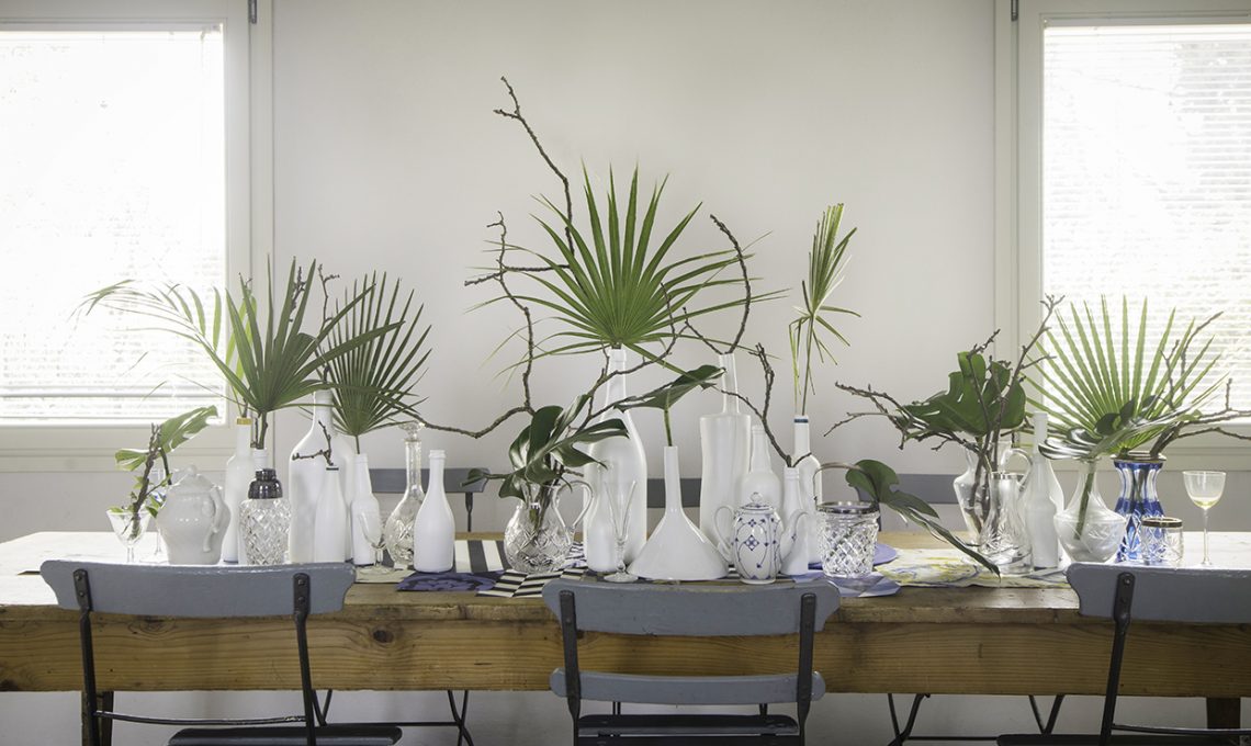 3 Comporre un centrotavola fai-da-te Recupera bottiglie diverse per forma e misura, stendi una o due mani di primer per vetro e poi una di smalto opaco bianco. Mixale con vecchie teiere, caraffe in cristallo