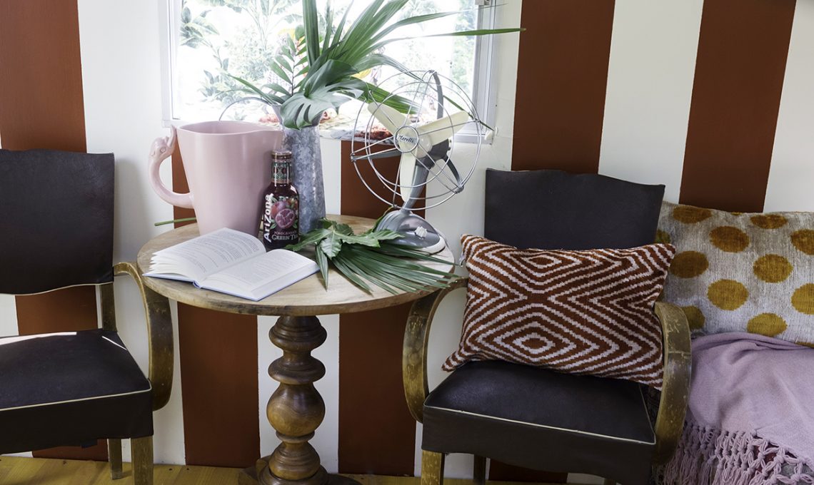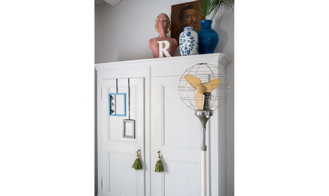 Anche qui, a personalizzare l’ambiente, immancabili pezzi vintage come il ventilatore sul tavolino antico, cuscino [Les ottomans €80 da Officina 33]. Sul tavolo, brocca rosa in ceramica [Rebirth Ceramics €98].