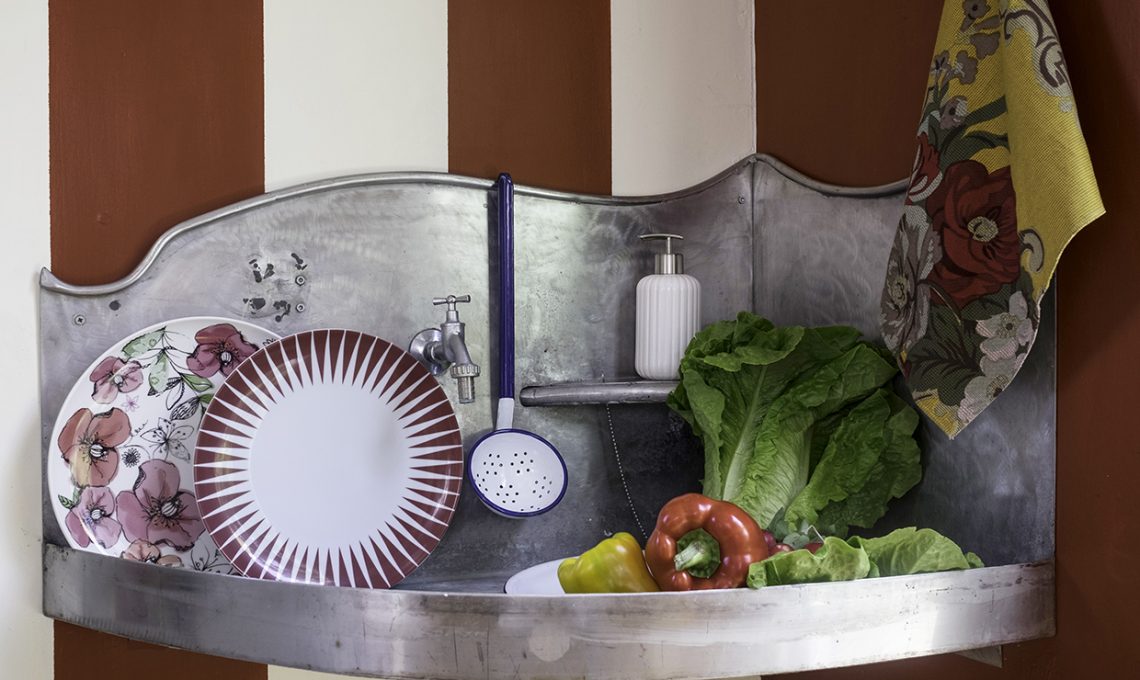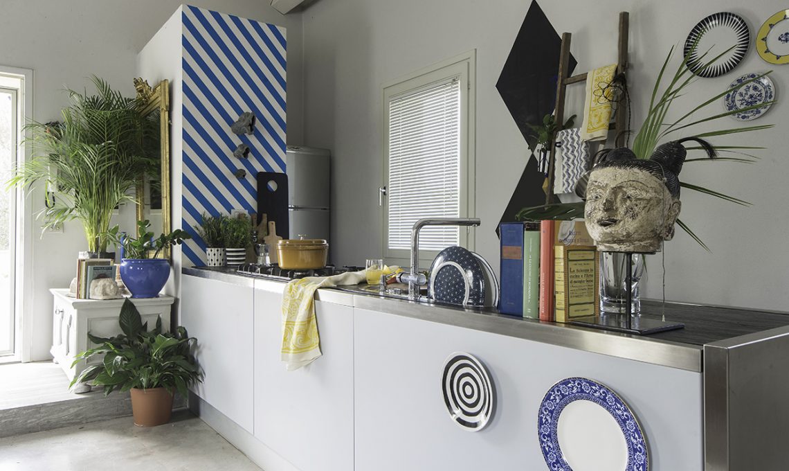 La testa di burattino birmana crea una mini scenografia [€250]. È di Officina 33 come la luce a pinza [€70] e la scala [€52], ideale per appendere gli strofinacci [simili da Pascucci]. Pentolino [Alessi]. Con la riga e il cutter ha tagliato righe e rombi per riportare il mood geometrico anche in cucina.