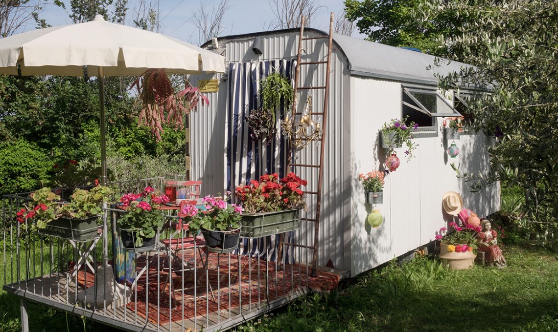 La vera chicca: in fondo al giardino, in mezzo agli ulivi, si trova, inaspettata, la camera per gli ospiti. Un vecchio caravan attrezzato con due letti, bagno e mini angolo cottura.