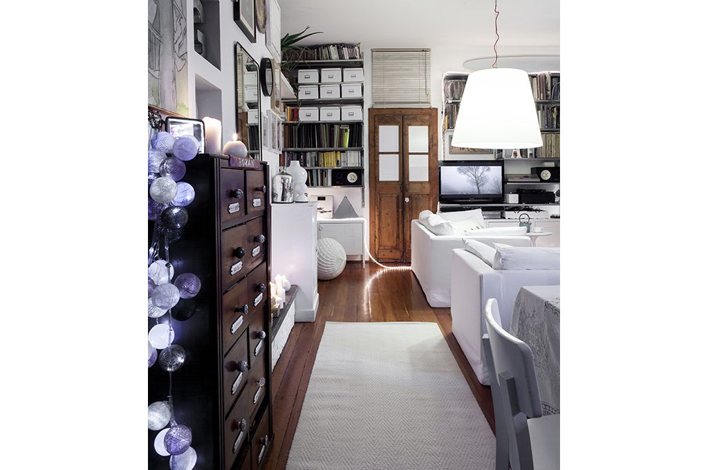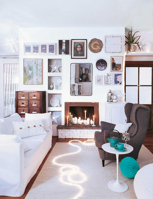 Le stelle luminose, il lungo tubo di lucine e le candele riscaldano l’atmosfera. Nel total white del divano Karlstad [Ikea, cm 205x93x80h €409] e del tavolino [Knoll], unica trasgressione il grigio della bergère Strandmon [Ikea, cm 82x96x101h €199].
