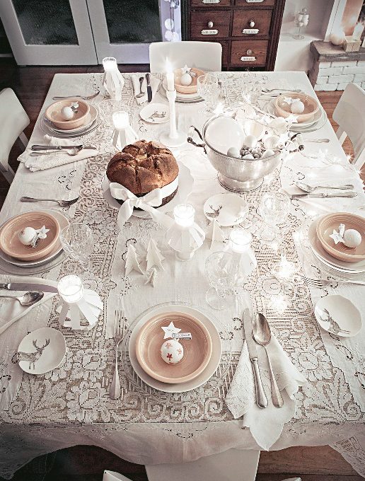 Dettagli raffinati e scintillii di luce per la tavola delle feste: calici Bernadotte [Villeroy&Boch €18,90], piatti bianchi [Iittala, da €18,50] abeti, sfere e piattini in porcellana smaltata [Giovelab], panettone [Cova].