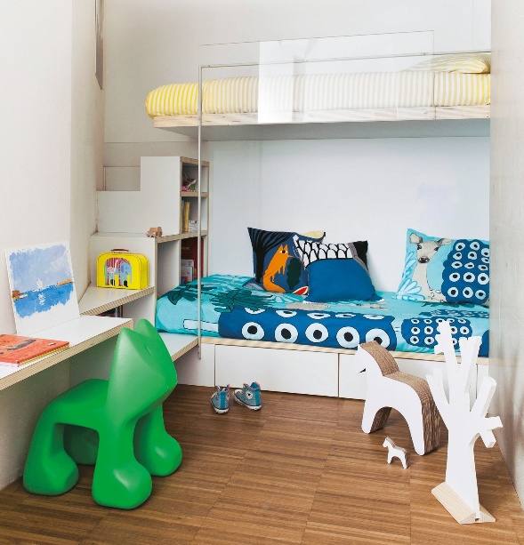 La cameretta dei bimbi è stata ricavata nella zona dove prima c’era il bagno, così da essere ben isolata dalla parte giorno della casa. Qui, tutti i mobili sono stati disegnati da Fabrizio, per adattarli all’andamento irregolare della pareti esterne. Per la notte ha creato un sistema di letti a castello in legno tutto bianco con una speciale scaletta contenitore (che da un lato prosegue con un lungo, lunghissimo piano adibito a scrivania) e cassettoni sottorete. Tessili e accessori dai colori vivaci, aggiunti dalla nostra Cristina, danno un tocco CF all’ambiente!