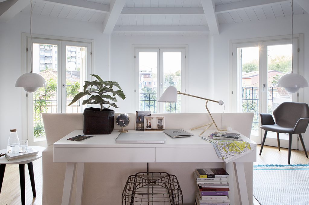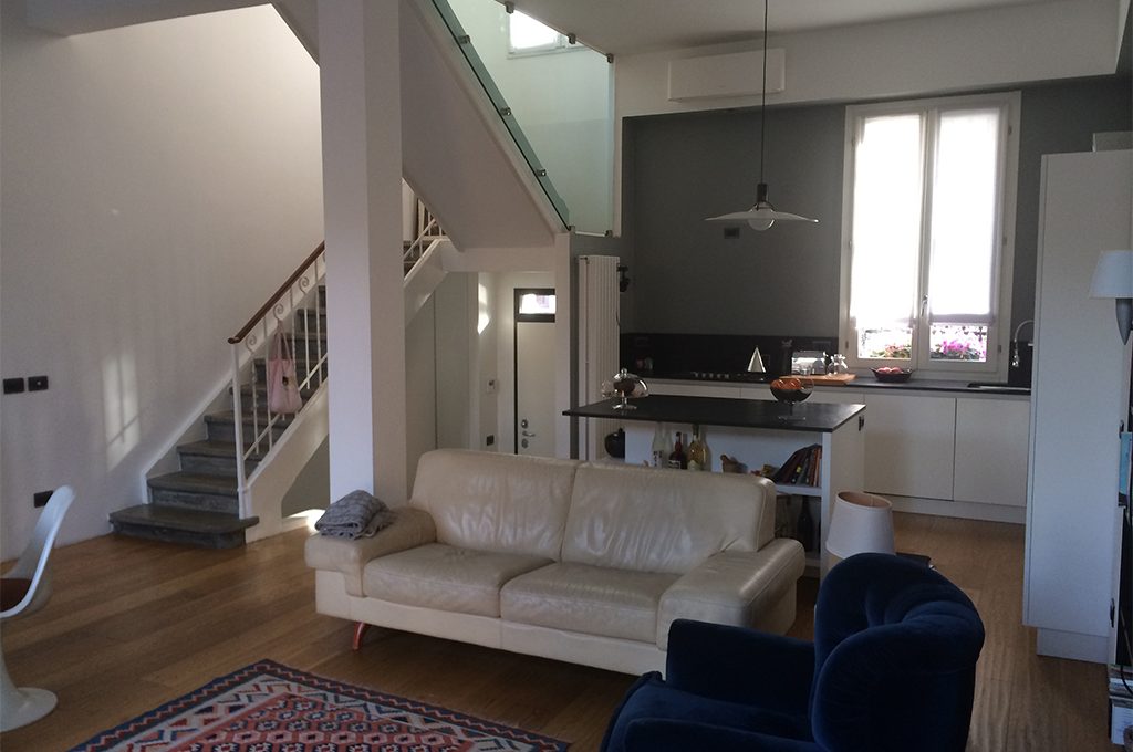 Quando l’abbiamo comprata, questa villetta degli Anni ’20, che fa parte di un complesso costruito per gli impiegati delle Poste, era divisa in microstanze: dove noi abbiamo il living ce n’erano addirittura tre in pochi metri quadri! Abbattuti i muri, però, l’open space risultava spoglio e freddo perché il pilastro strutturale, che non avevamo potuto eliminare, dominava la scena. La parete vetrata è stata la soluzione a più problemi: divide ma al tempo stesso unisce, perché è trasparente e permette di vedersi. Inoltre, per un curioso effetto ottico, ora la stanza sembra più grande!MANSARDA