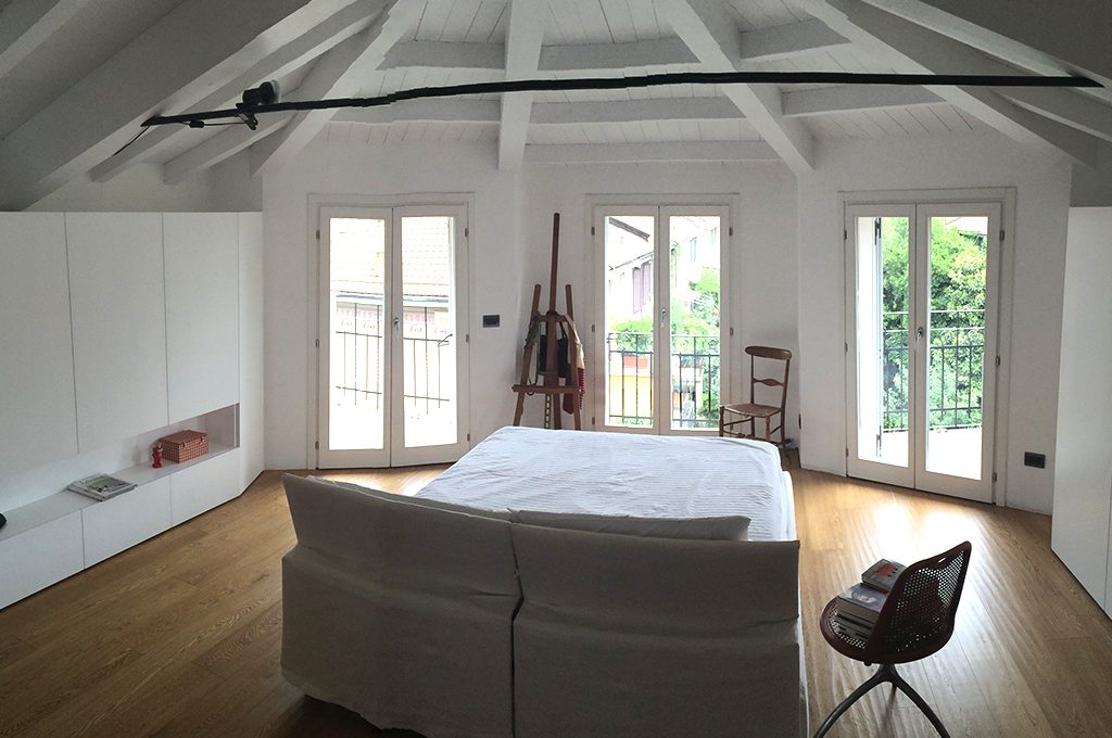 La camera matrimoniale è stata ricavata recuperando il sottotetto, intervento che deve rispettare un regolamento regionale. Serve un architetto (noi ci siamo rivolti all’arch. Roberta Pradella, Milano, tel. 339/6066102). Per le norme della Lombardia, il sottotetto può essere recuperato se alto almeno m 1,80; e la stanza, una volta ristrutturata, deve essere alta minimo m 2,40. Per conoscere le regole della tua Regione, cerca “recupero sottotetto” su » mansarda.itCOPIA L'IDEA: come mimetizzare due porte scorrevoli